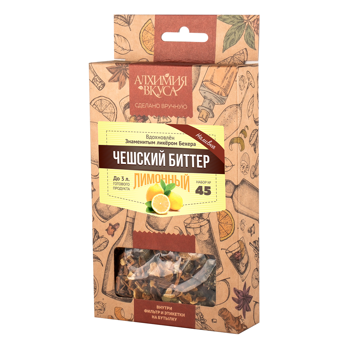 Набор для приготовления наливки «Чешский биттер лимонный» - это всеми любимый ароматный ликёр, ингредиенты от которого вошли и в этот набор, но были дополнены сочными цитрусами, а также была снижена крепость готового продукта и смягчен вкус. Освежающий, питкий и яркий ликёр. Состав: цедра лимона, цедра лимона сладкая, цедра апельсина, корица дробленная, чипсы из российского дуба , мята, кориандр, перец душистый, корень солодки, анис, кардамон.