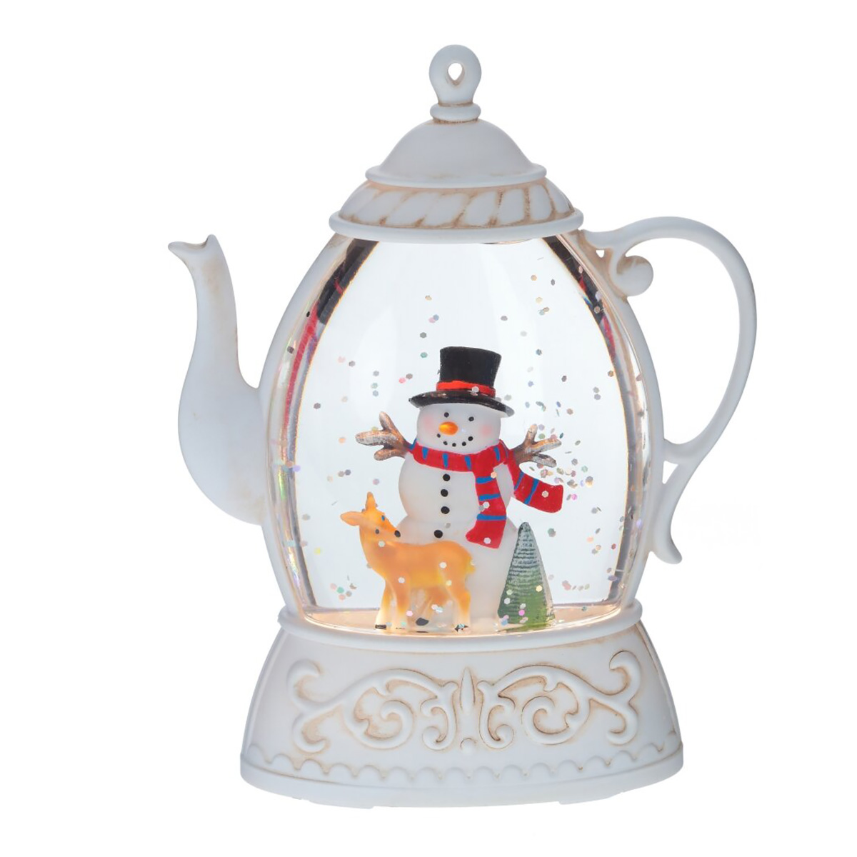 Замечательное новогоднее украшение, которое хочется долго рассматривать и держать в руках. Внутри чайника фигурка веселого Снеговика с олененком. Снизу рычаг включает подсветку. При включении шар внутри словно оживает. Сотни серебристых частичек глитера в глицериновой жикости медленно закруживаются в танце света и блеска. Безупречная форма, изысканный дизайн, качественное исполнение. Этот уникальный подарок приносит с собой уют и теплые воспоминания о детстве. Работает от двух батареек ААА [не прилагаются]. Внимание: при длительном нахождении в минусовой температуре возможно образование льда, который сместит фигурки и повредит изделие. Наличие воздушной прослойки внутри является технической необходимостью производства.
