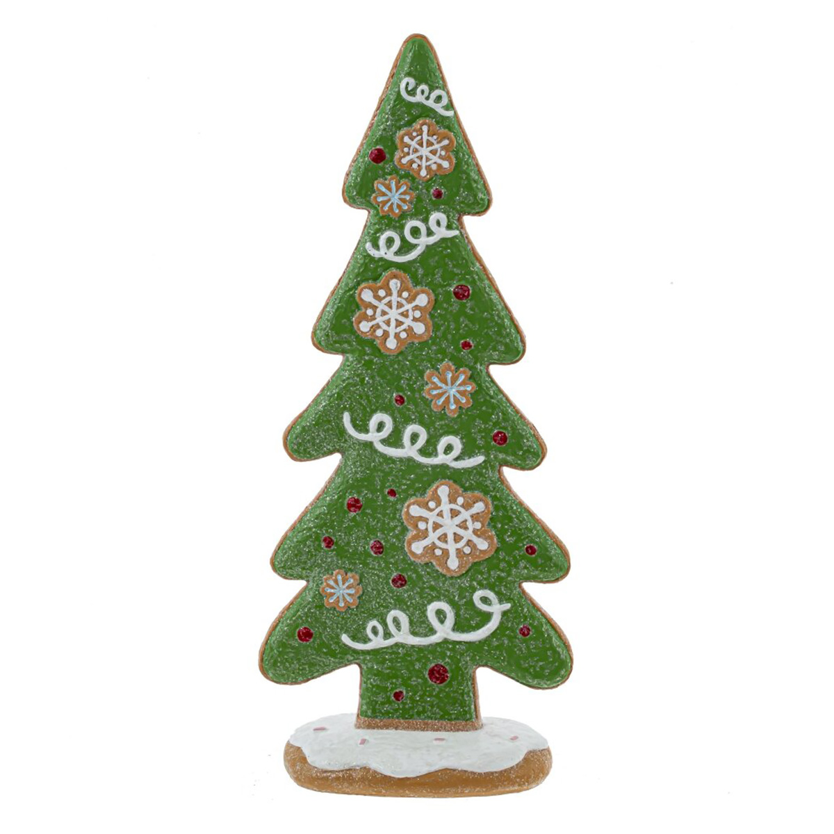 Декоративная новогодняя фигурка представляет собой пряничную елку, украшенную сахарной глазурью. Эта уникальная фигурка выполнена из полимерных материалов и имеет высоту 31 см. Зеленая глазурь, украшенная различными узорами, придает фигурке такой аппетитный вид, что так и хочется откусить кусочек. Эта декоративная елочка станет украшением вашего дома во время новогодних праздников, добавив уюта и волшебства в ваш интерьер.