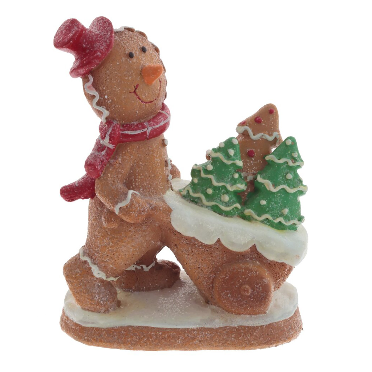 Фигурка декоративная "Пряник" высотой 16 см изготовлен из полимера напоминающего глину. Этот пряничный человечек в нарядном красном цилиндре, везущий тележку со сладкими елочками, так и просится на праздничный стол. Этот сувенир станет прекрасным подарком и добавит атмосферы и уюта в новогодний интерьер.