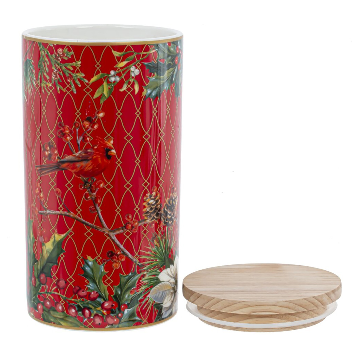 Емкость для сыпучих продуктов "Рождественский вальс" на 1000 мл - это изысканный предмет, который добавит новогоднего волшебства в вашу кухню. Изготовленная из тонкостенного фарфора, эта емкость объединяет в себе элегантность и функциональность. На ярком красном фоне с золотистым решетчатым узором расположены красивые рождественские символы - красные и белые цветы пуансеттии, ветви с яркими ягодами и чарующая птичка кардинал. Практичная бамбуковая крышка оборудована силиконовым уплотнителем. Эта емкость не только украсит вашу кухню во время праздников, но и станет незаменимым помощником в хранении различных сыпучих продуктов. Погрузитесь в атмосферу Рождественского вальса с помощью прекрасной посуды этой серии!