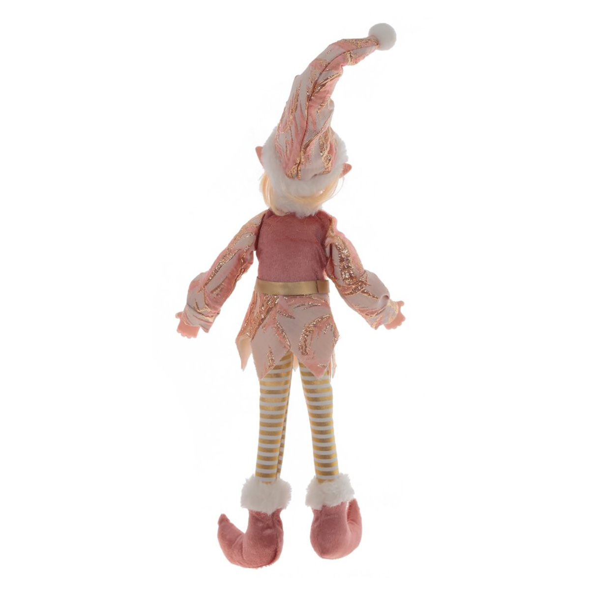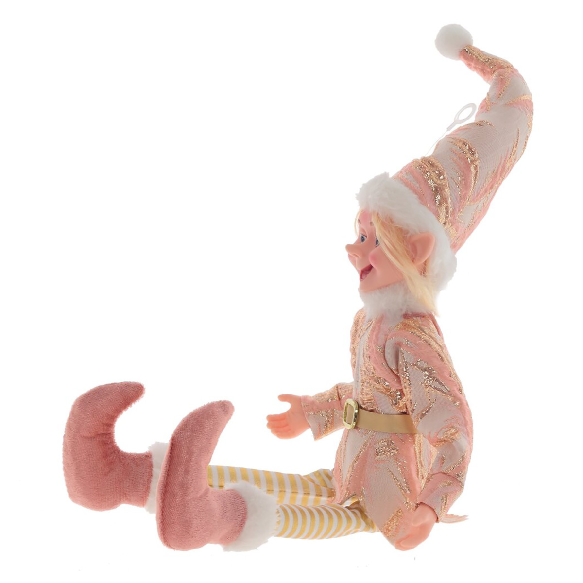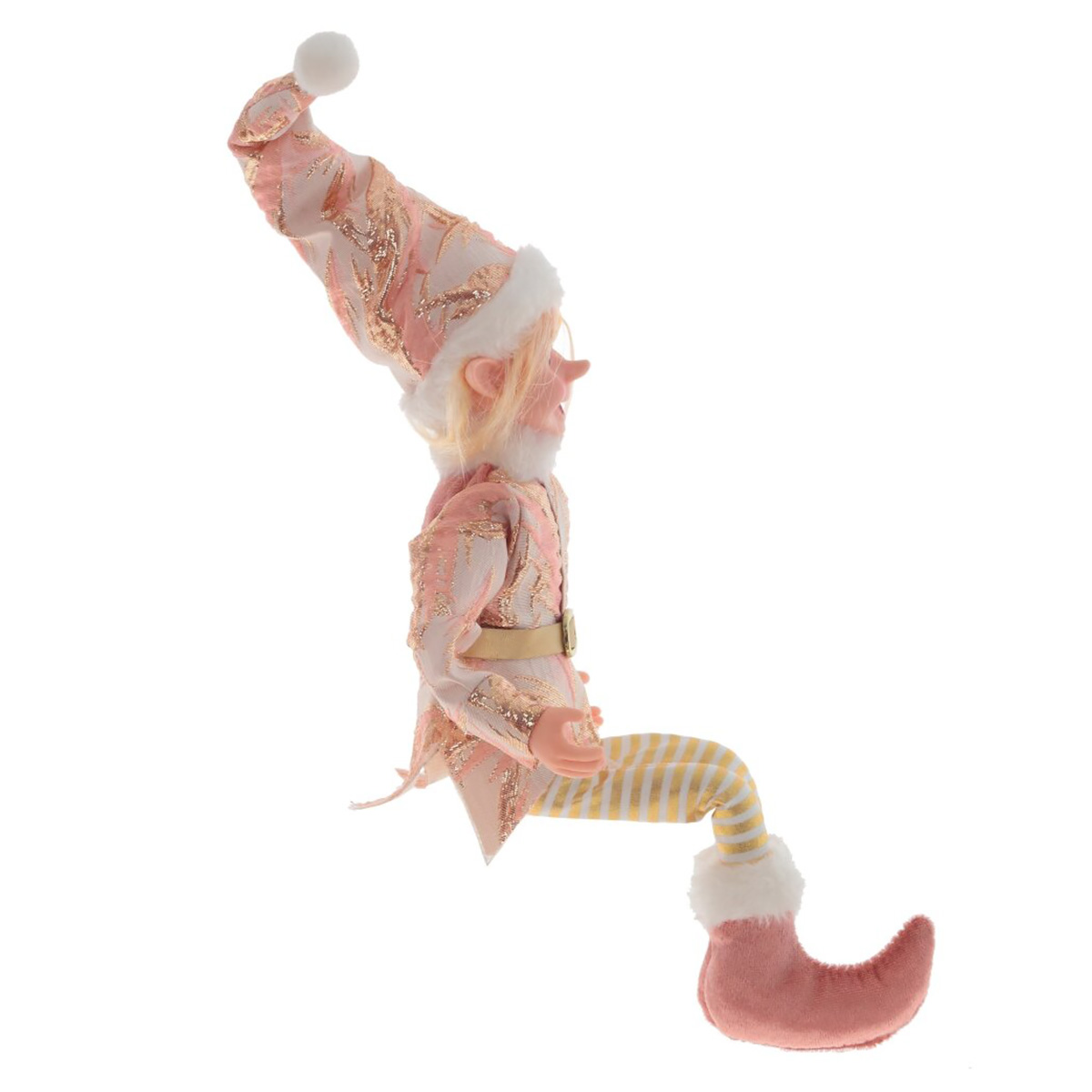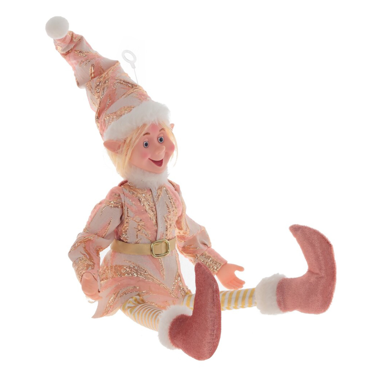 Веселый декоративный Эльф в праздничном блестящем розовом костюме и колпаке заражает радостью. Он имеет реалистичные лицо и кисти рук из полимерных материалов. Уникальность игрушки заключается в том, что благодаря проволоке внутри рук и ног можно создавать различные позы, что добавляет игривости образу. Благодаря петле на колпаке, эту игрушку можно легко повесить на елку или другое место в интерьере.