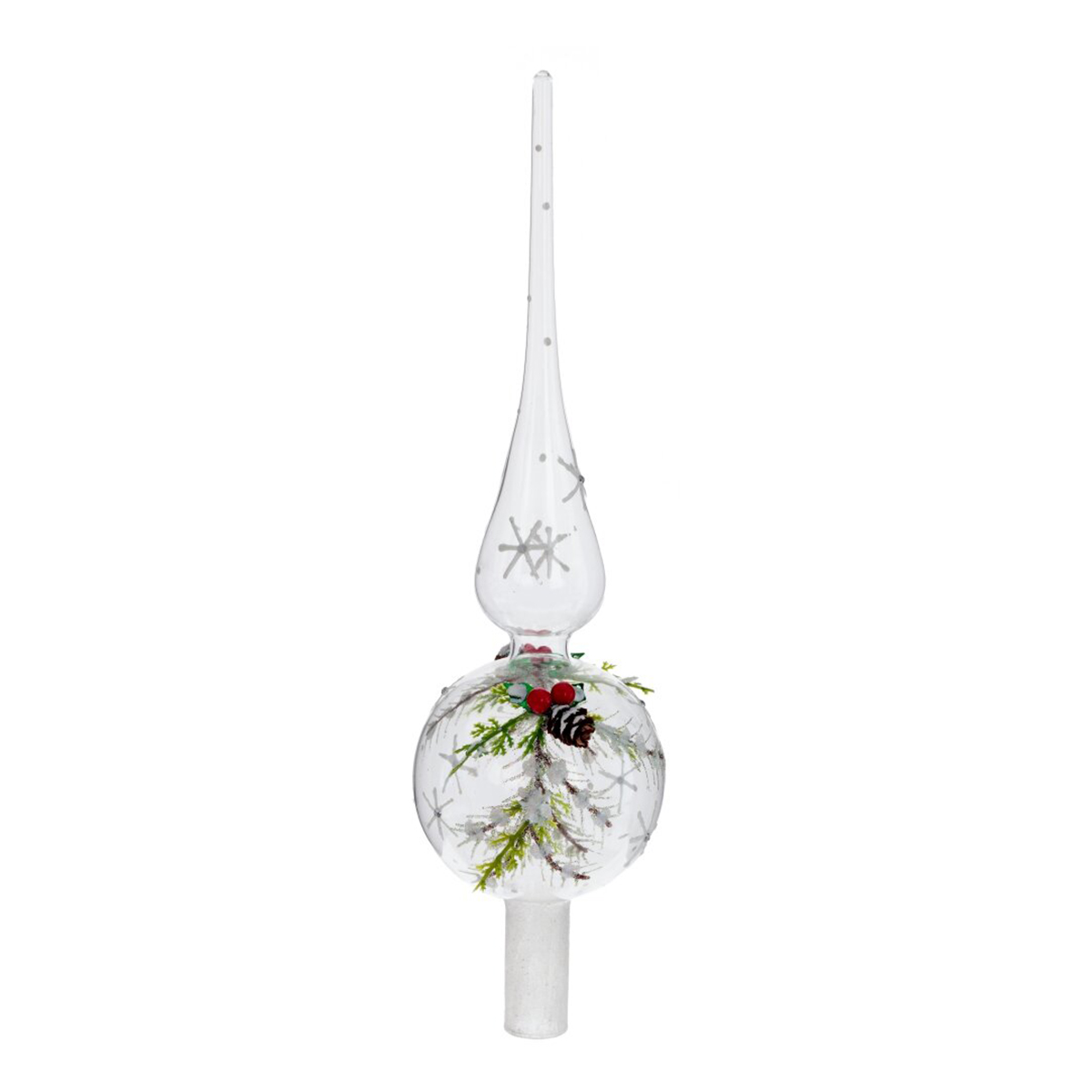 Эта елочная верхушка из стекла станет прекрасным завершением вашей новогодней елки. Она выполнена в классическом стиле и добавляет изысканности праздничному декору. Прозрачное стекло и белые снежинки мерцают на свету, создавая волшебную атмосферу праздника, а заснеженная еловая веточка с шишкой и ягодками добавляют природного шарма. Идеальный выбор для создания уюта!