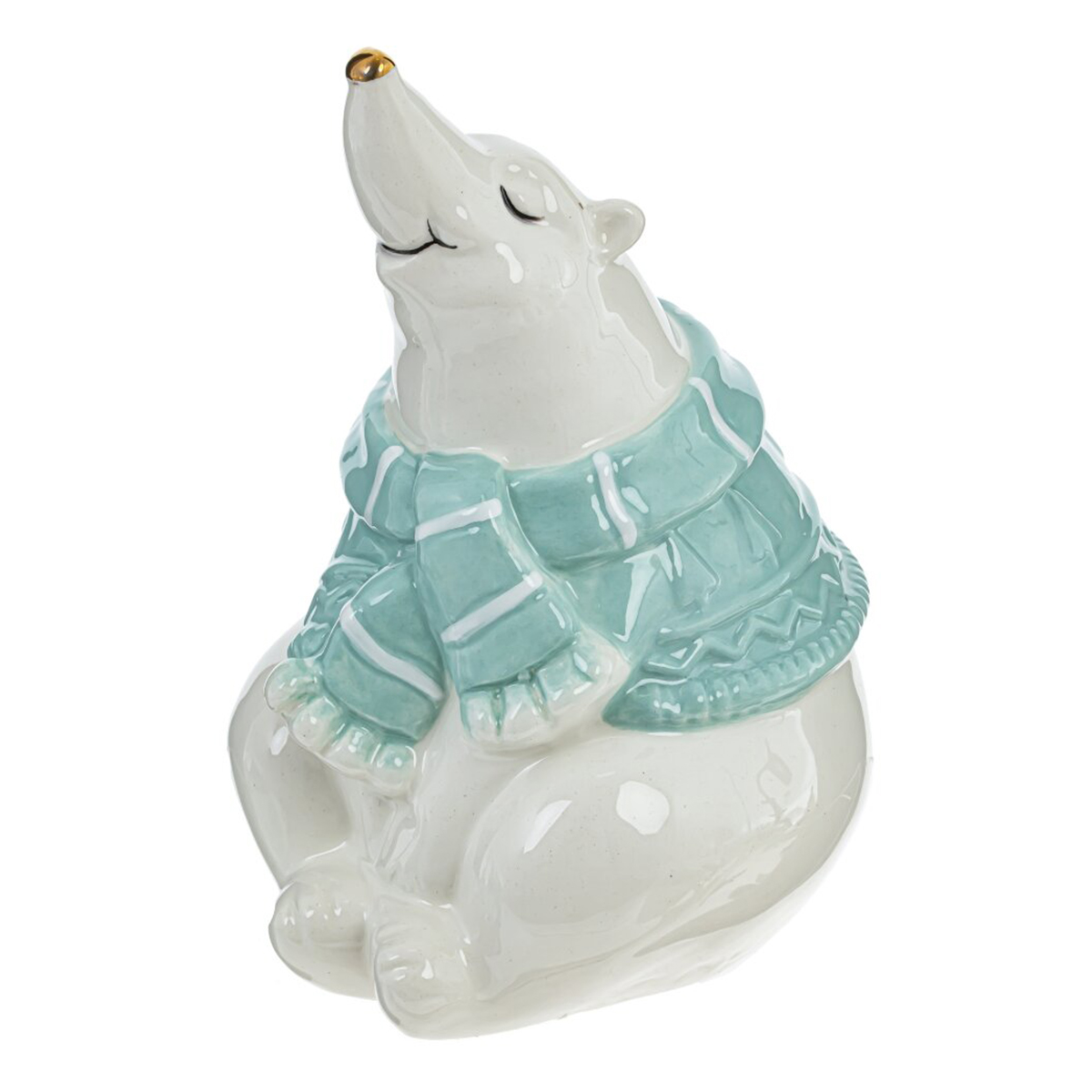 Копилка "Белый Медведь мечтатель" — это изящное изделие, выполненное из белоснежной керамики. Очаровательный медведь, облачившийся вголубой свитер и шарф, мечтательно закрывает глаза, словно погружён в зимние грёзы. Его расслабленная поза и добродушная улыбка создают атмосферу тепла и спокойствия, напоминая о уютных зимних вечерах. Эта копилка не только поможет сбережениям, но и станет стильным аксессуаром для украшения вашего интерьера, привнося в него чуточку волшебства.