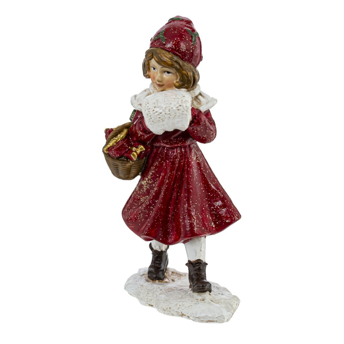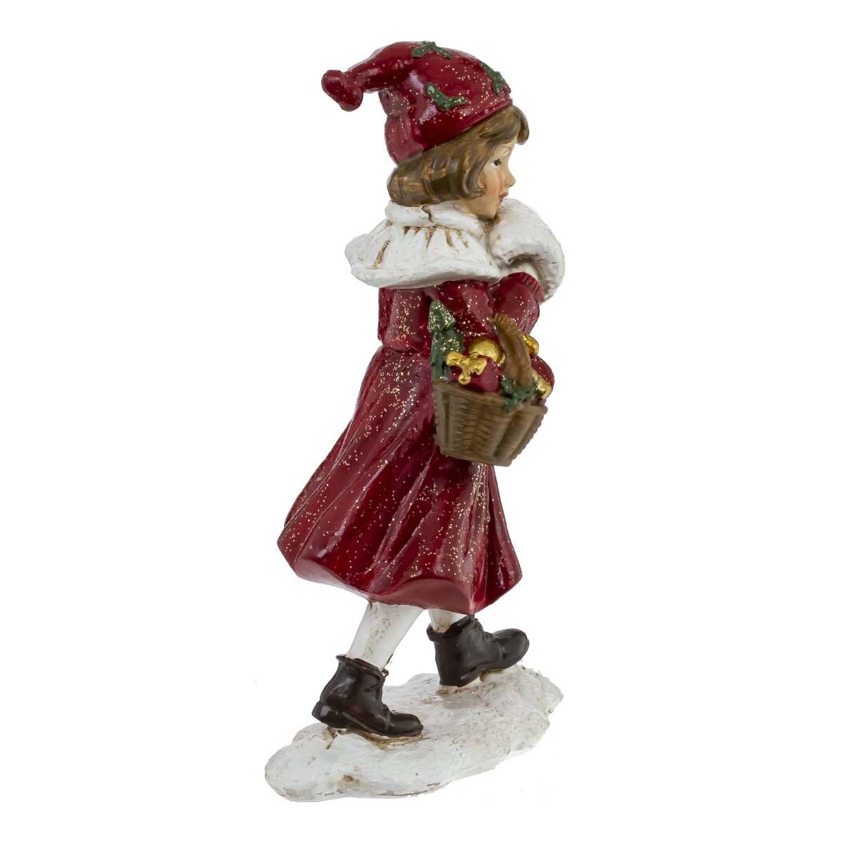 Декоративная фигурка девочки с корзинкой вызывает яркое представление о прекрасной зимней картине, где маленькая красивая девочка идет с подарками по зимнему городу. Красное пальто и шапочка, белая пушистая муфта, а еще блестящий глиттер, имитирующий мягкий снег - все это создает уютную и волшебную атмосферу праздника. Высота фигурки 12 см делает ее идеальным элементом декора как на столе, так и на полочке. Она уверенно приковывает взгляд и поднимает настроение своим внешним видом и милым образом.