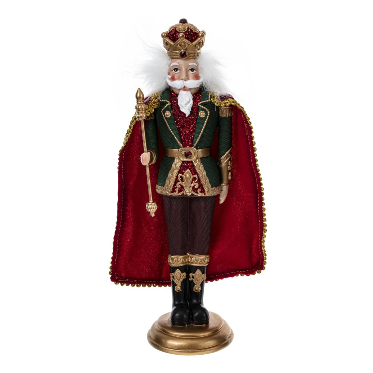 Фигурка декоративная "Щелкунчик" — это изящная статуэтка из полистоуна, установленная на круглой золотой подставке. Щелкунчик одет в нарядный костюм, дополненный красным бархатным плащом, который придает ему величественный вид. Его седые волосы, выполненые из мягкого искусственного меха, и нарядный кивер добавляют образу королевского стиля. Яркие зеленые и красные оттенки костюма, украшенного золотыми акцентами, делают эту фигурку настоящим произведением искусства, способным украсить любой новогодний декор.