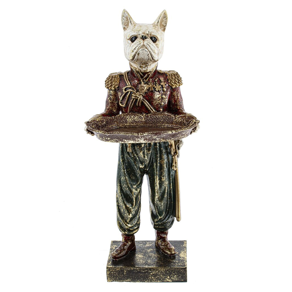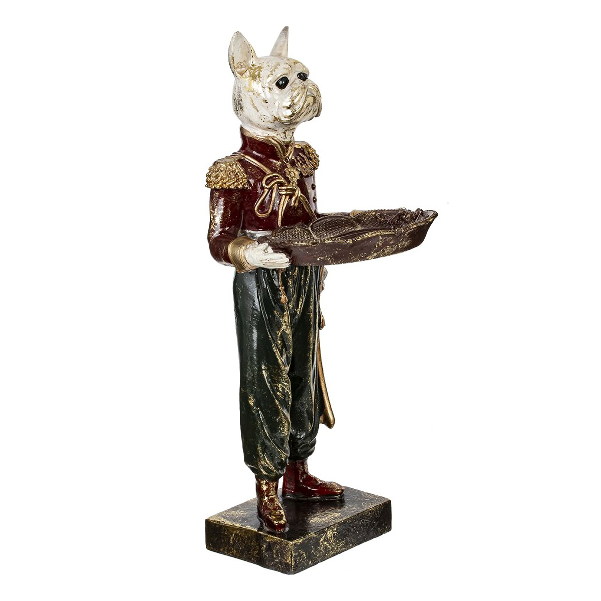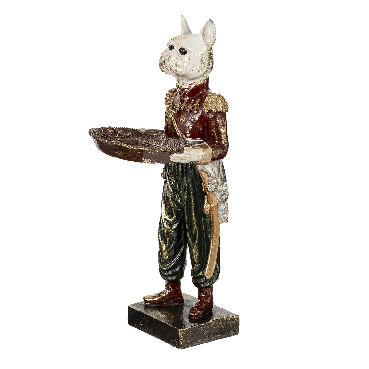 Декоративная статуэтка "Собака" из полистоуна изображает белого бульдога в военном мундире, держащего декоративное блюдо для хранения украшений. Фигура установлена на подставке и выполнена в технике патинирования, что добавляет изделию дополнительный шарм и элегантность. Эта статуэтка привлечет взгляды и эффектно впишется в роскошный интерьер.