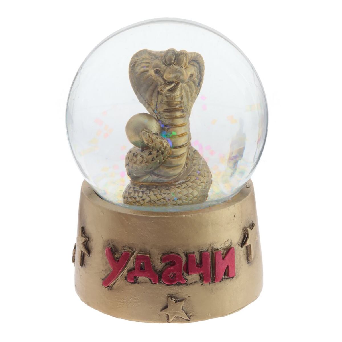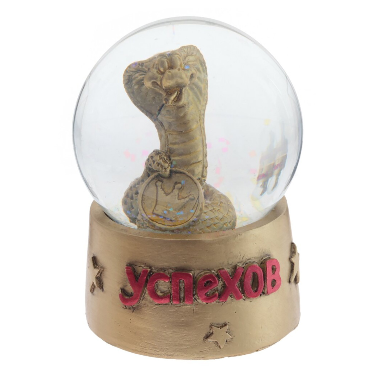 Декоративный стеклянный водяной шар с символом года — змеей — представляет собой удивительный новогодний сувенир, который украсит любой праздник. Внутри шара расположена змея-кобра из полистоуна, выполненная в элегантном золотом цвете. Она уверенно располагается на подставке, украшенной пожеланием, которое добавляет изделию особый шарм. Сверкающий глиттер внутри шара создает завораживающий визуальный эффект при каждом встряхивании. Шар представлен в трех вариантах с надписями: "Удачи", "Счастья", "Успехов", что делает его уникальным и подходящим подарком для близких и друзей в наступающем году Змеи.