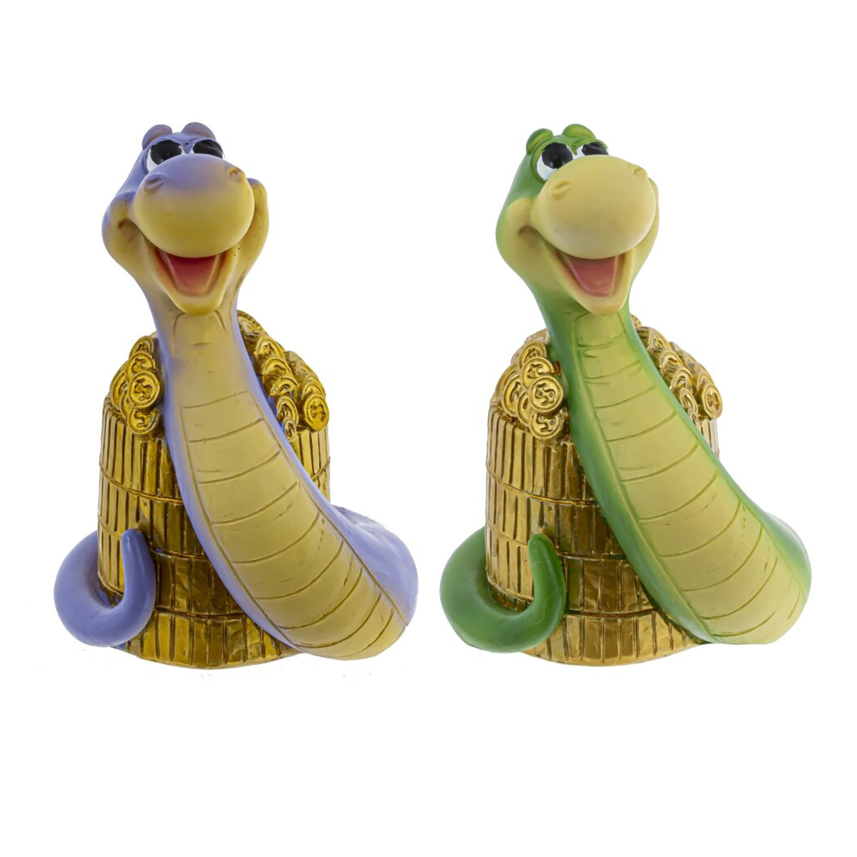 Копилка "Змея" - прекрасный новогодний сувенир, символизирующий грядущий год. Сделанная из качественного полимерного материала и имеющая высоту 10 см, она представлена в виде веселой змейки зеленого или фиолетового цвета, которая обвивает бочку с золотыми монетами. Удобное отверстие сзади копилки позволяет легко складывать монеты, а на нижней расположен удобный клапан, облегчающий извлечение накопленных средств. Этот сувенир не только украсит интерьер, но и принесет удачу и изобилие в новом году. Без возможности выбора дизайна.