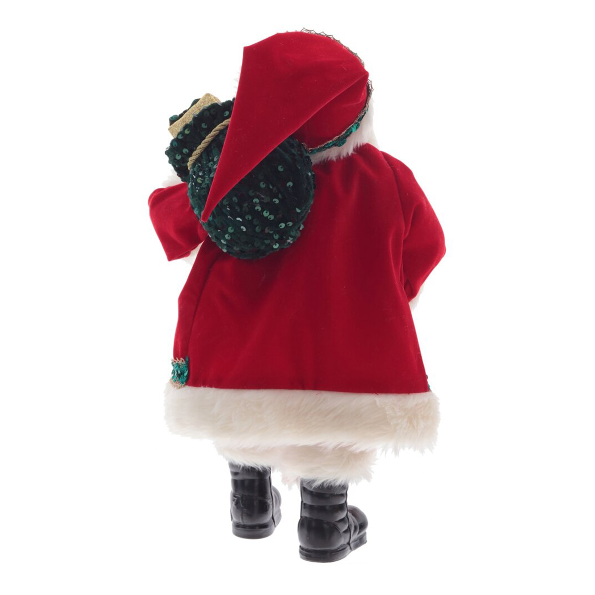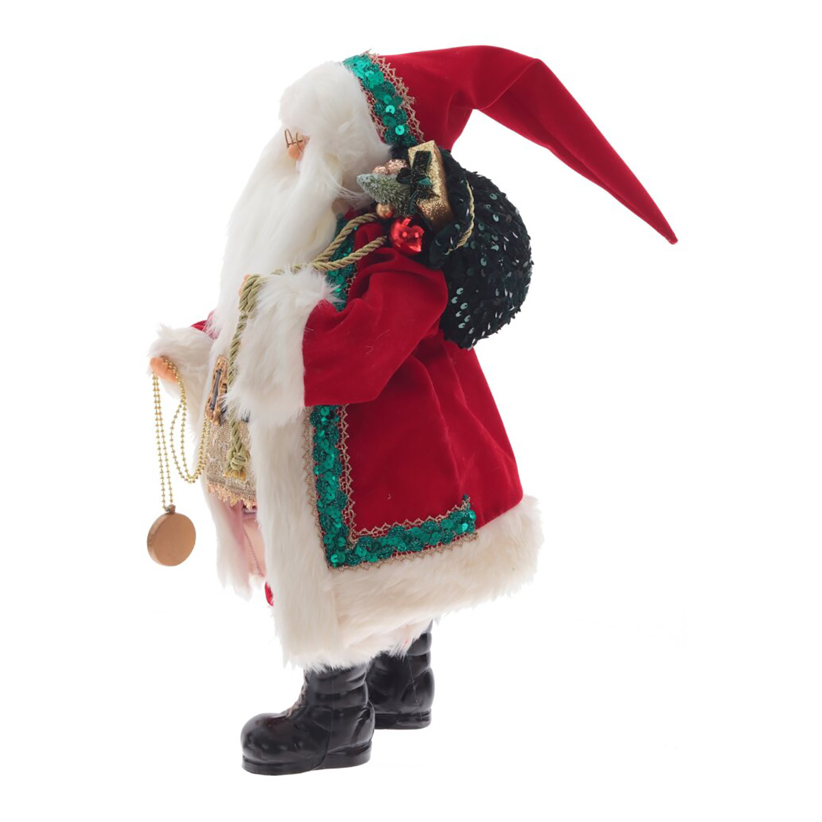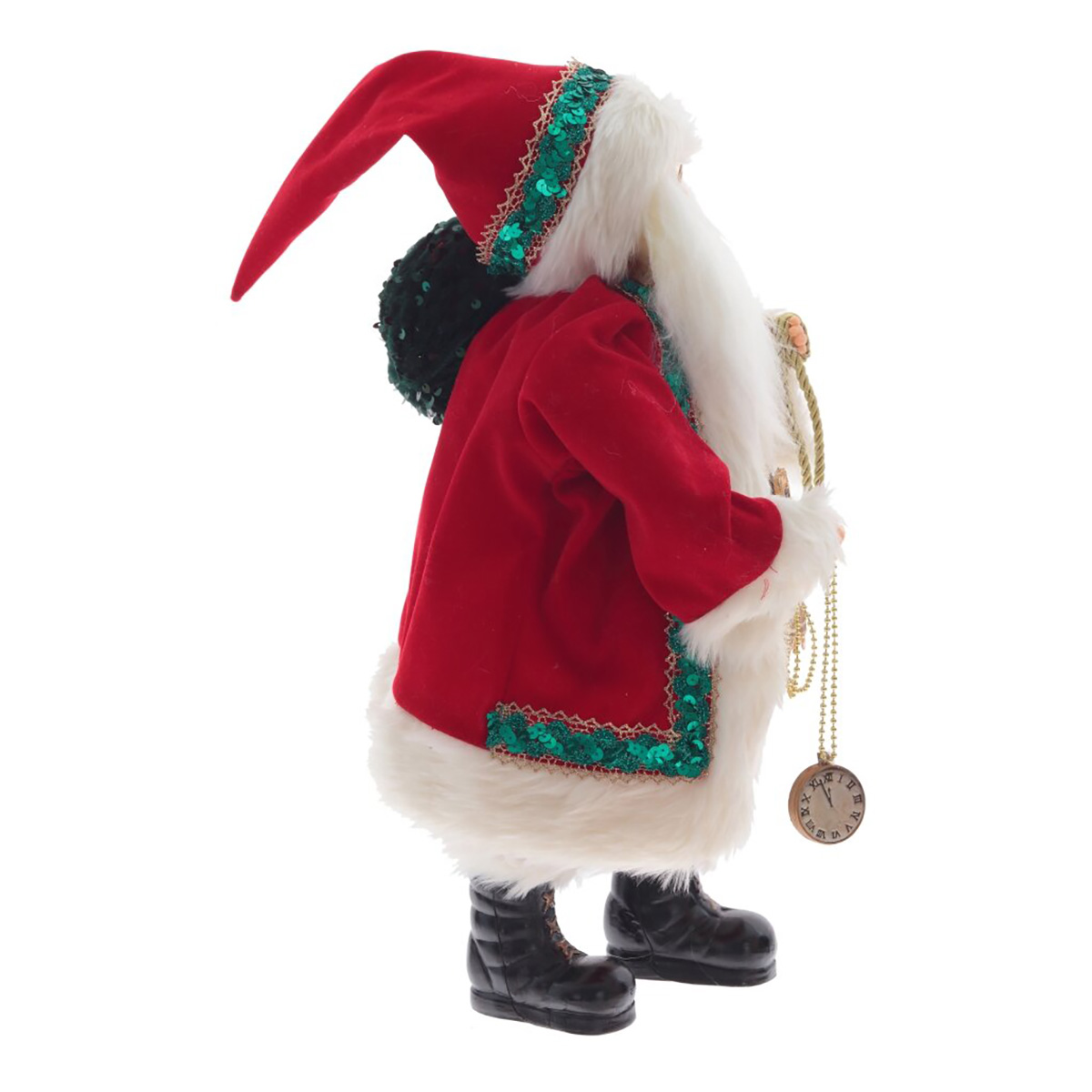 Очаровательный Дед Мороз, высотой 65 см, в роскошном красном бархатном костюме с белой меховой отделкой и эффектной золотой сорочкой выглядит просто сказочно. Его образ дополняет зеленый мешок для подарков, изящно расшитый пайетками, а также золотые часы на цепочке, которые придают ему особый шарм. Реалистично выполненное лицо, руки и сапоги из полимерных материалов делают куклу живой и выразительной, придавая ей тёплый и дружелюбный вид. Эта декоративная фигурка станет великолепным акцентом вашего интерьерного оформления и станет прекрасным подарком на праздник. Она прекрасно дополнит новогоднюю атмосферу в вашем доме, создавая чувство волшебства и радости в это время года.