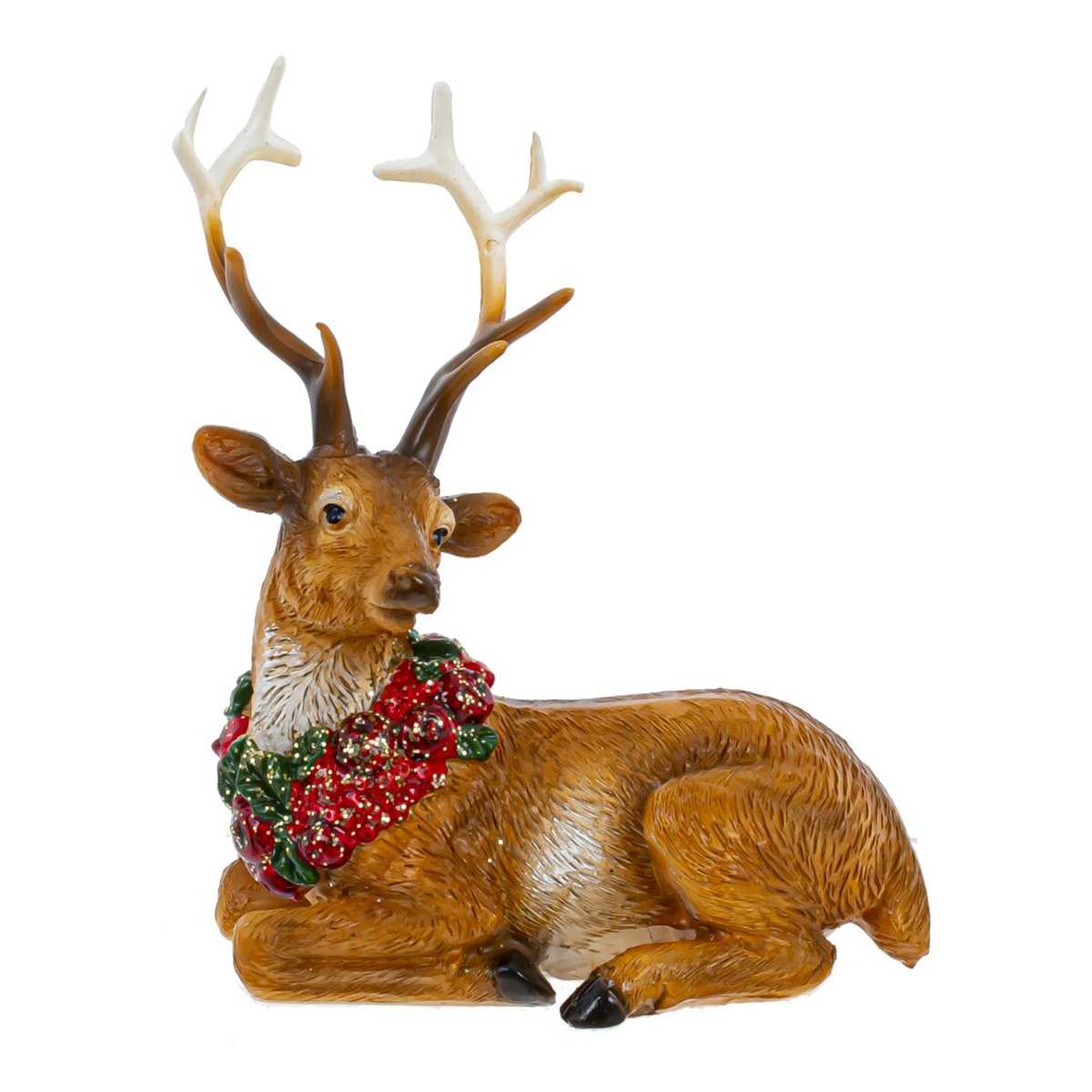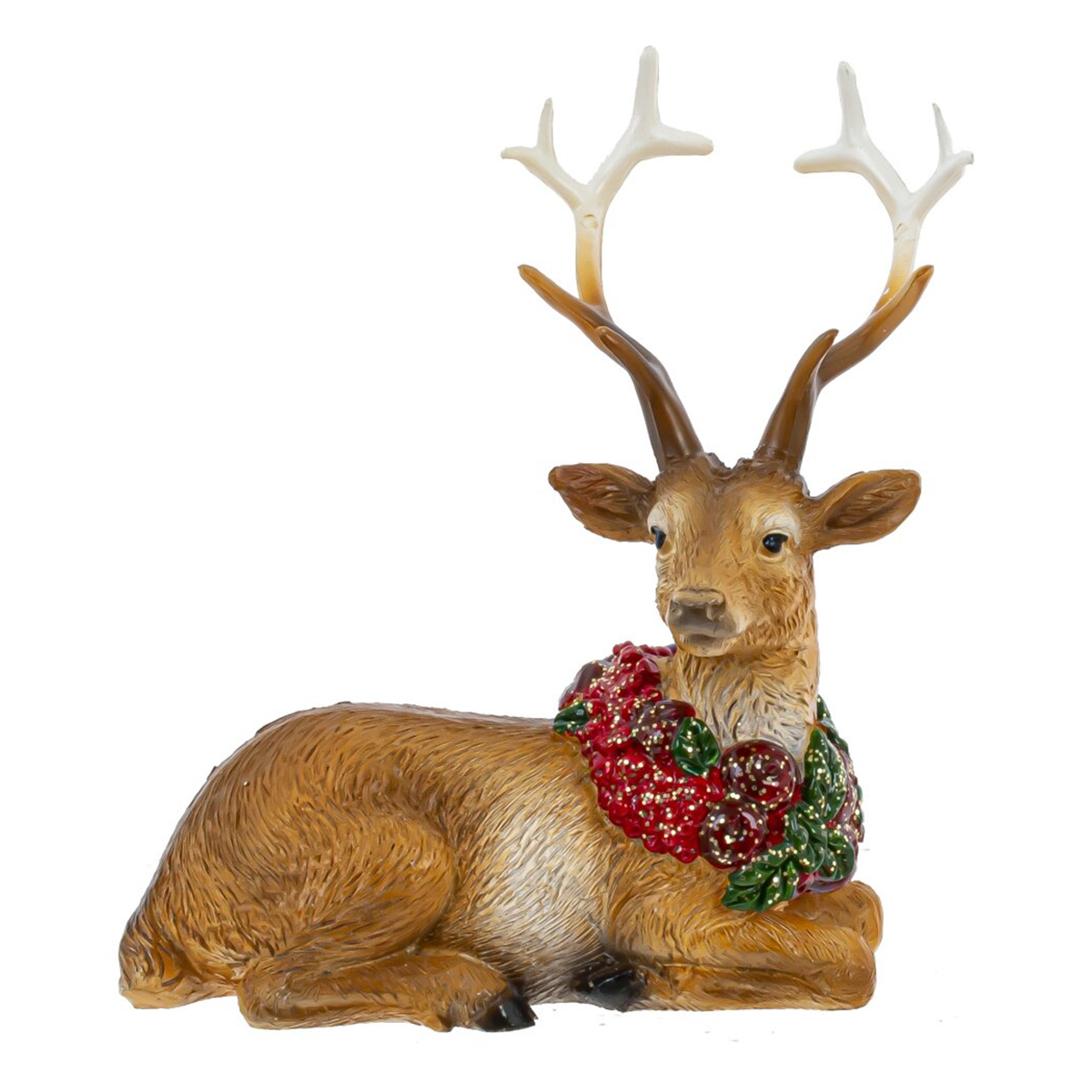 Декоративная фигурка "Олень" — это потрясающее новогоднее украшение, созданное из полимерного материала. Этот грациозный и реалистичный рыжий олень привлекает внимание своей красотой. Его шею обвивает яркий венок, добавляющий праздничного настроения. Олень мирно лежит, олицетворяя спокойствие и умиротворение. Элегантные рога придают ему величественный вид. Эта новогодняя статуэтка станет замечательным акцентом в вашем интерьере, добавляя атмосферу волшебства и уюта!
