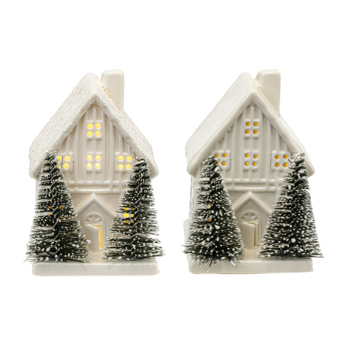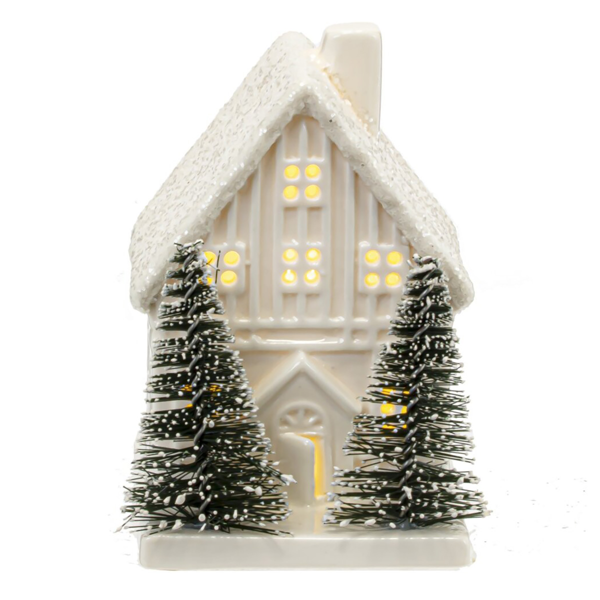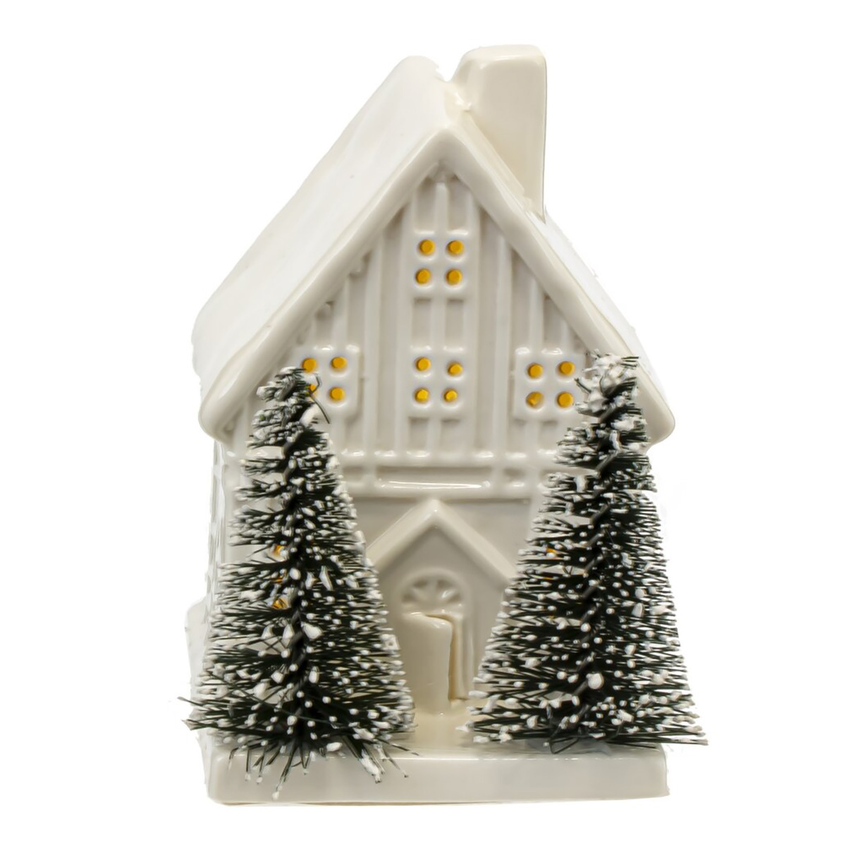 Эта очаровательная миниатюра станет прекрасным дополнением к вашему праздничному декору. Белоснежный домик украшен искрящимся шиммером, словно укутан пушистым снегом, что создает атмосферу волшебного Рождества. Блестящая поверхность фарфора придает фигурке особое праздничное очарование.Встроенная подсветка, спрятанная в домике, создает мягкое и теплое свечение, которое делает его еще более уютным и привлекательным. В темное время суток, окна домика будут ярко гореть, напоминая о волшебстве праздника. Разместите фигурку на каминной полке, на праздничном столе или на полке с другими новогодними украшениями - она будет гармонично вписываться в любой интерьер и создавать атмосферу праздника.