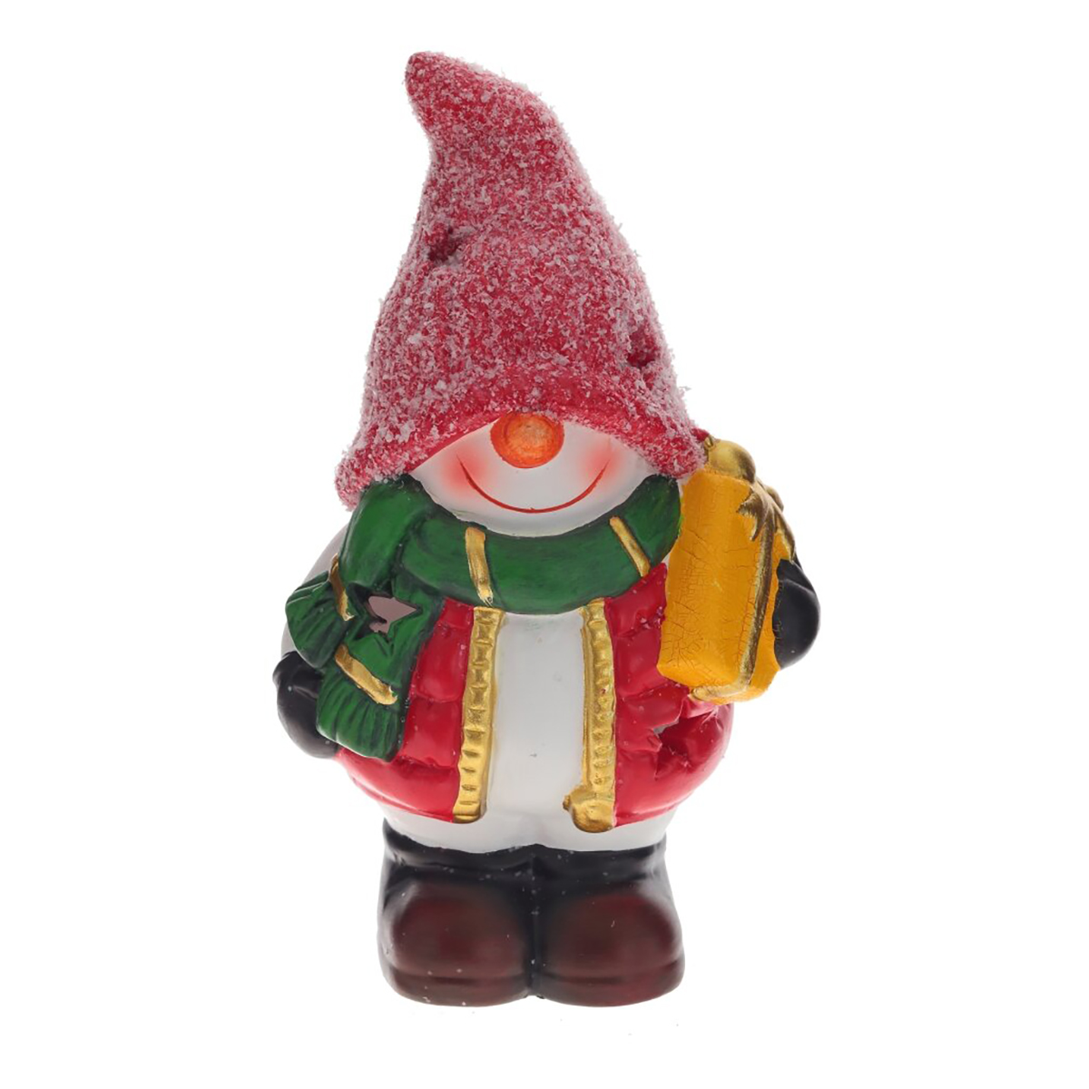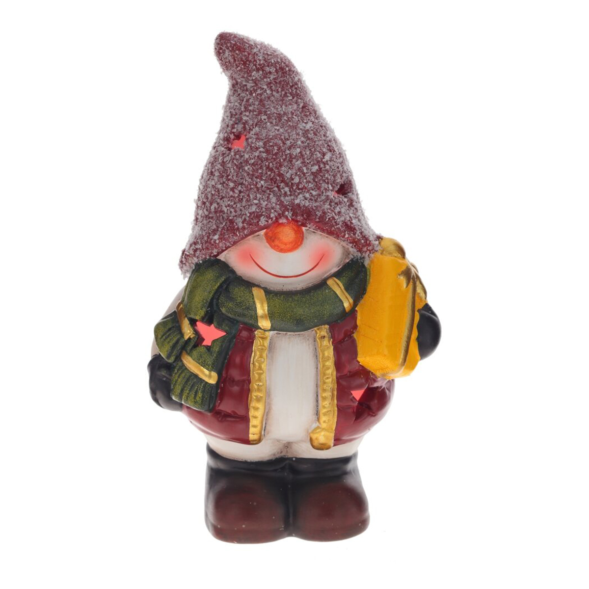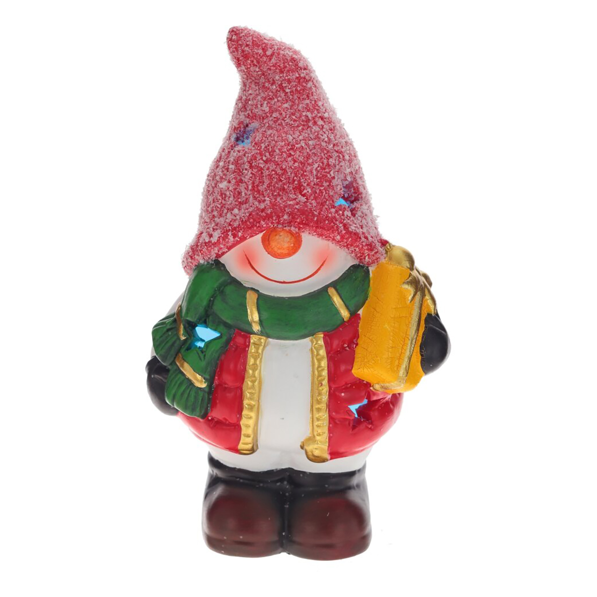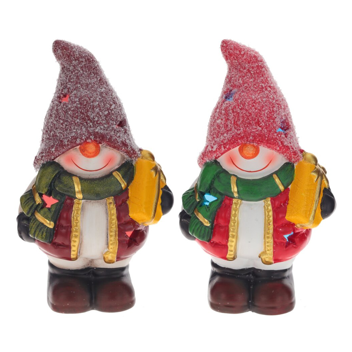 Декоративная фигурка с подсветкой "Снеговик" изготовлена из керамики. Веселый снеговик в колпаке, украшенном снежным глиттером, держит подарок. Через отверстия в форме звезд видна цветная подсветка, которую можно включить с помощью рычага на дне фигурки. Работает от двух батареек LR44 [входят в комплект]. Эта фигурка создаст уют и праздничное настроение в вашем доме на новогодние праздники. Представлена в двух вариантах красном и бордовом цвете.