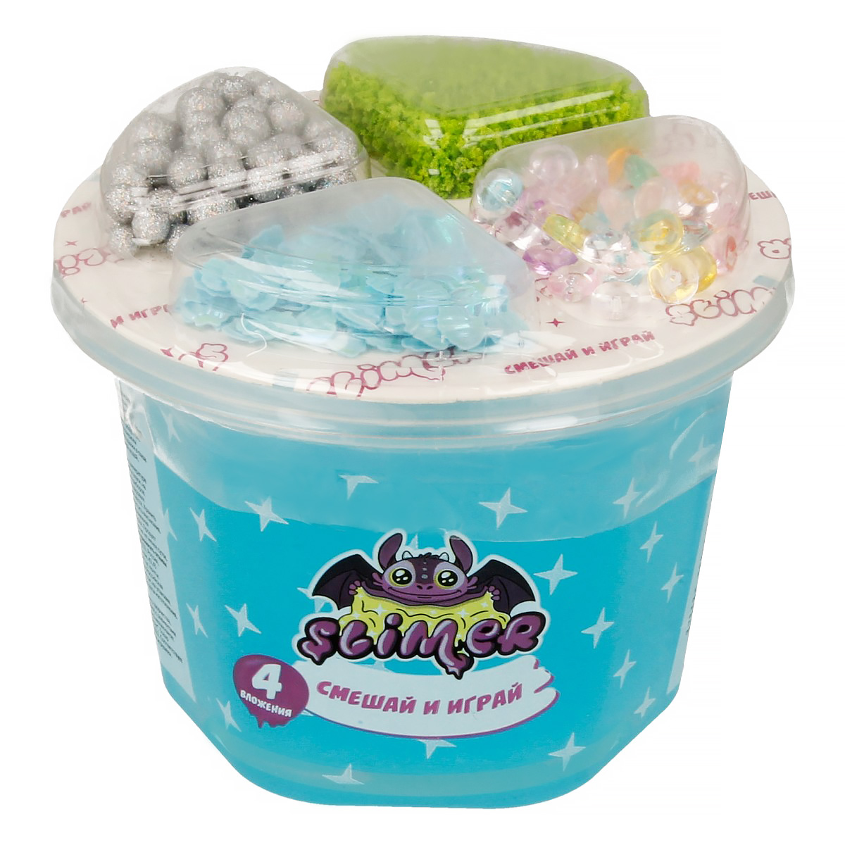 Все очень любят экспериментировать и добавлять в свои слаймы наполнители. Это стимулирует воображение и мелкую моторику, займёт ребенка на долгое время. В набор Slimer Смешай и играй входят: красочный полупрозрачный слайм, пенопластовые шарики, блестки, голографические фигурки, посыпка. Вложения придадут слайму красивый блеск и неповторимый вид при его растягивании. Слайм приятно похрустывает, кликает.