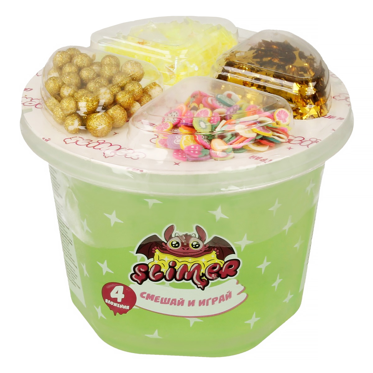 Все очень любят экспериментировать и добавлять в свои слаймы наполнители. Это стимулирует воображение и мелкую моторику, займёт ребенка на долгое время. В набор Slimer Смешай и играй входят: красочный полупрозрачный слайм, пенопластовые шарики, блестки, голографические фигурки, посыпка. Вложения придадут слайму красивый блеск и неповторимый вид при его растягивании. Слайм приятно похрустывает, кликает.