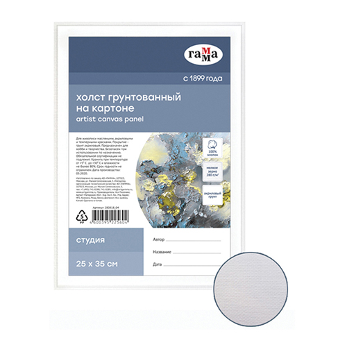 Хлопковый холст ГАММА серии «Студия», грунтованный на картоне, подойдёт для живописи масляными, акриловыми, темперными и гуашевыми красками. Основа – натуральное полотно, 100% хлопок, мелкое зерно. Холст прямоугольной формы плотностью 280 г/м2, размер – 25*35 см. Холст имеет акриловый грунт. Изготовлен без использования кислот. Подходит студентам художественных школ и училищ, начинающим и профессиональным художникам. • плотность 280 г/м?; • мелкое зерно; • 100% хлопок; • акриловый трёхслойный грунт; • материал основы – картон