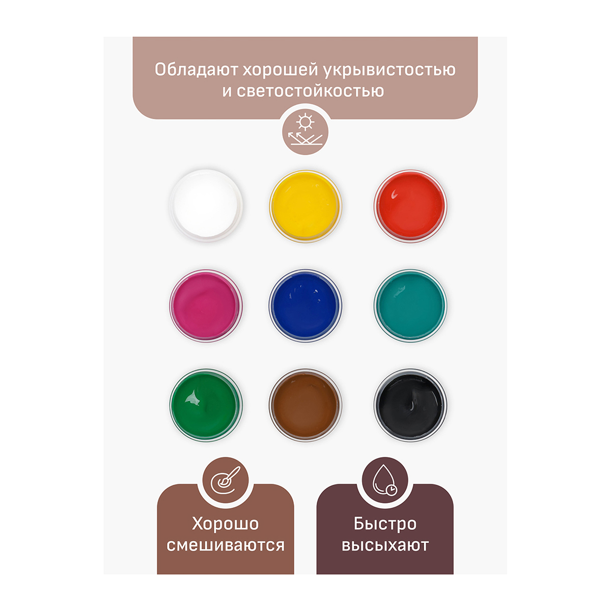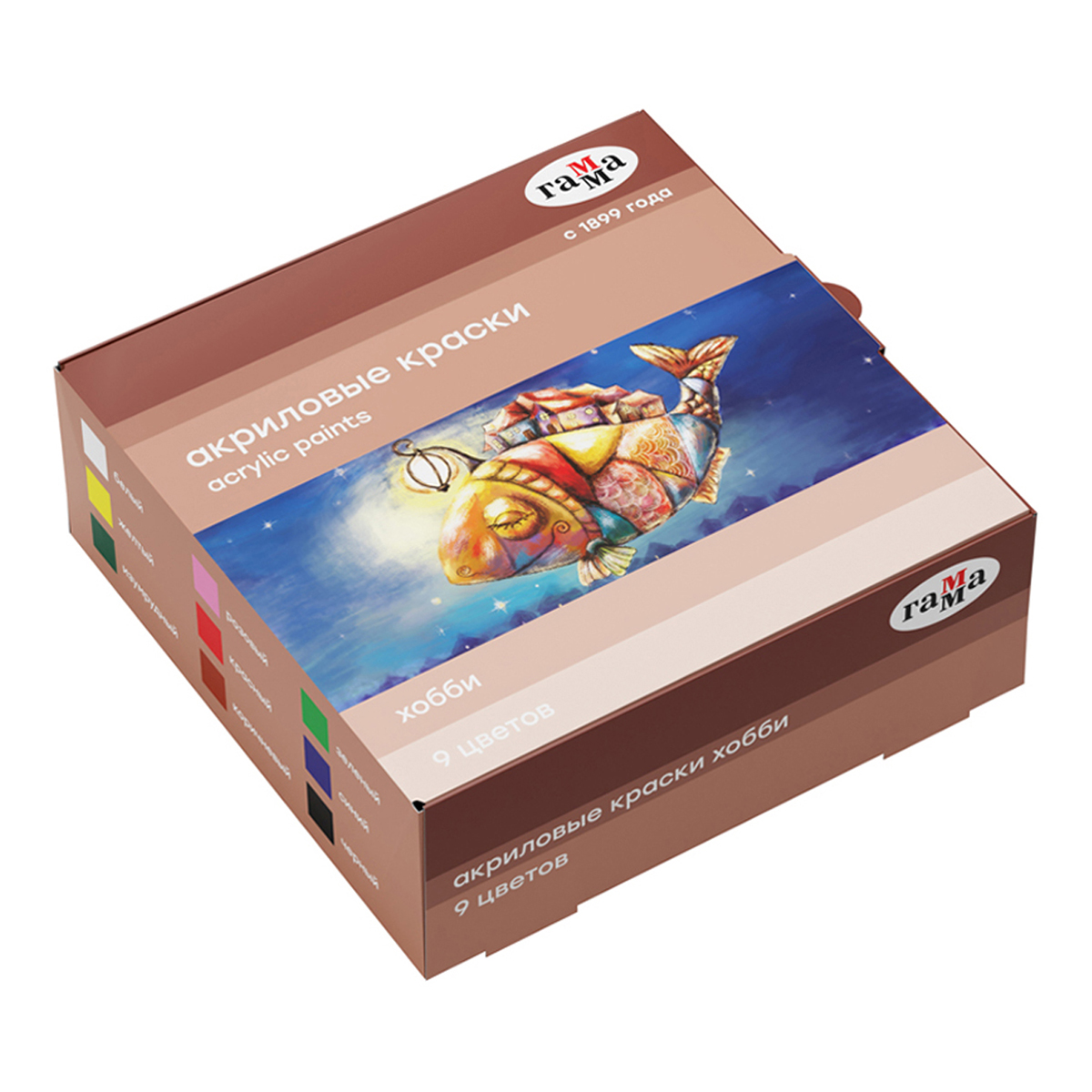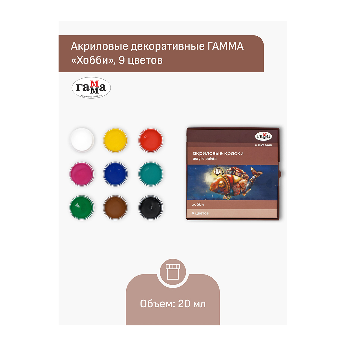 Акриловые краски серии «Хобби» предназначены для декоративно-оформительских работ и росписи бумаги, картона, холста, дерева, металла, гипса. Краски обладают высокой укрывистостью, хорошо смешиваются и быстро высыхают. После высыхания создают на поверхности глянцевый красочный слой. Акрил «Хобби» морозостиойкий, выдерживает транспортировку при низких температурах. Благодаря удобной герметичной баночке с завинчивающейся крышкой, краски долго хранятся, не высыхая. В наборе 9 цветов: белый, жёлтый, изумрудный, розовый, красный, коричневый, зелёный, синий, чёрный. Объём одной баночки — 20 мл, общий объём — 180 мл. • Количество цветов: 9; • Упаковка: баночка с крышкой; • Объём: 20 мл.
