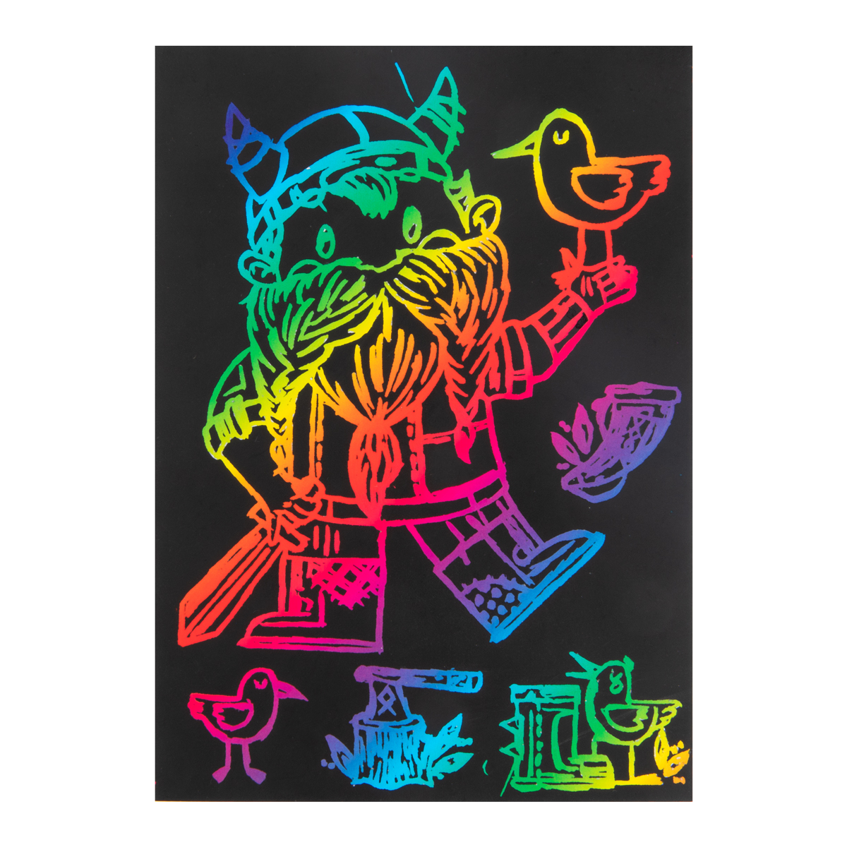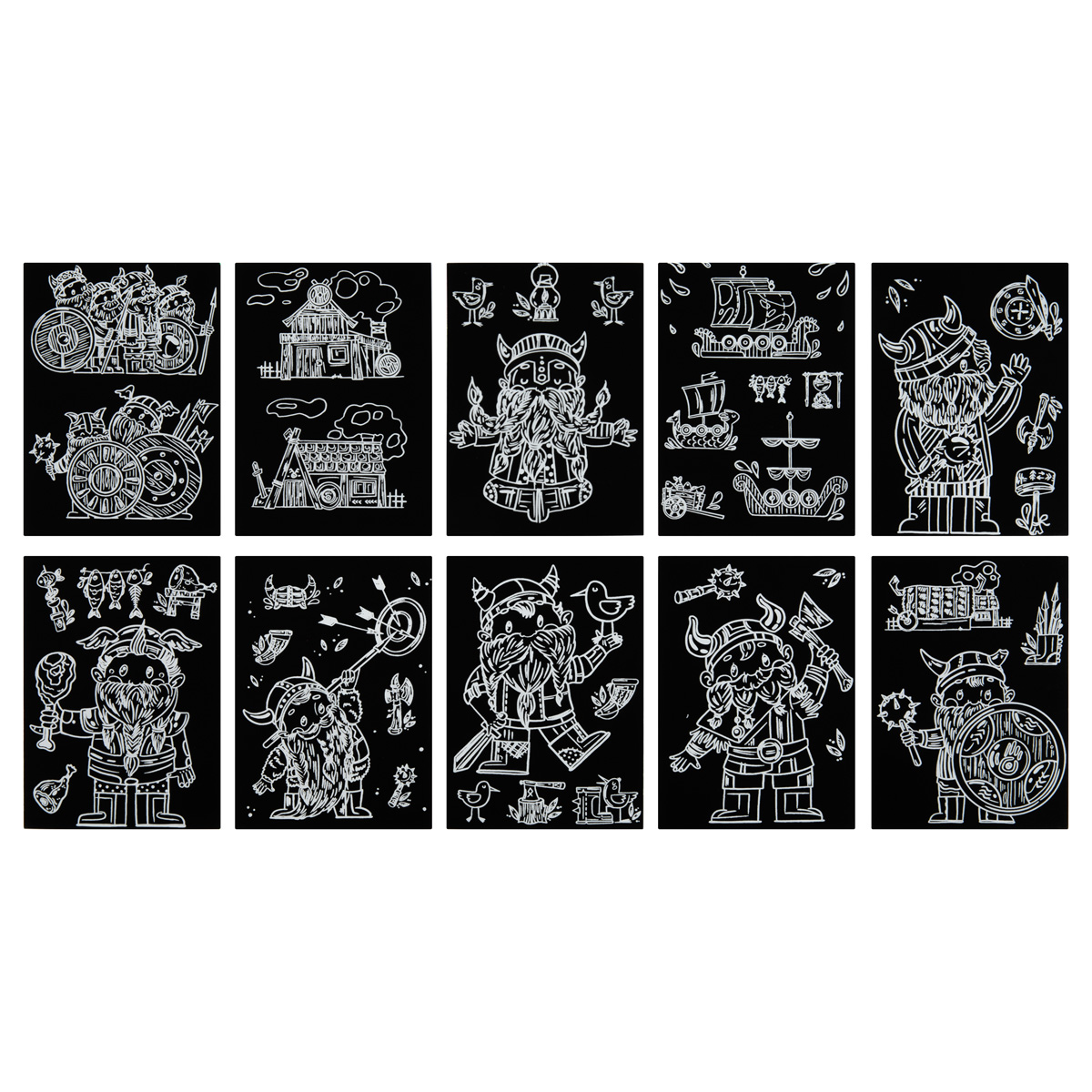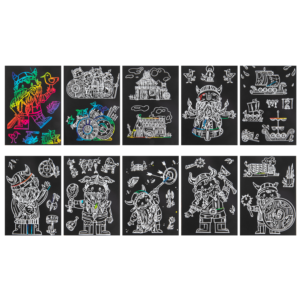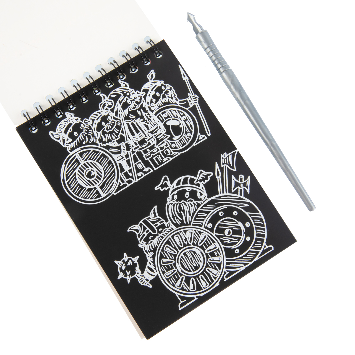 Гравюра-блокнот с разнообразными рисунками на страницах и специальным пластиковым штихелем для создания красочных работ.