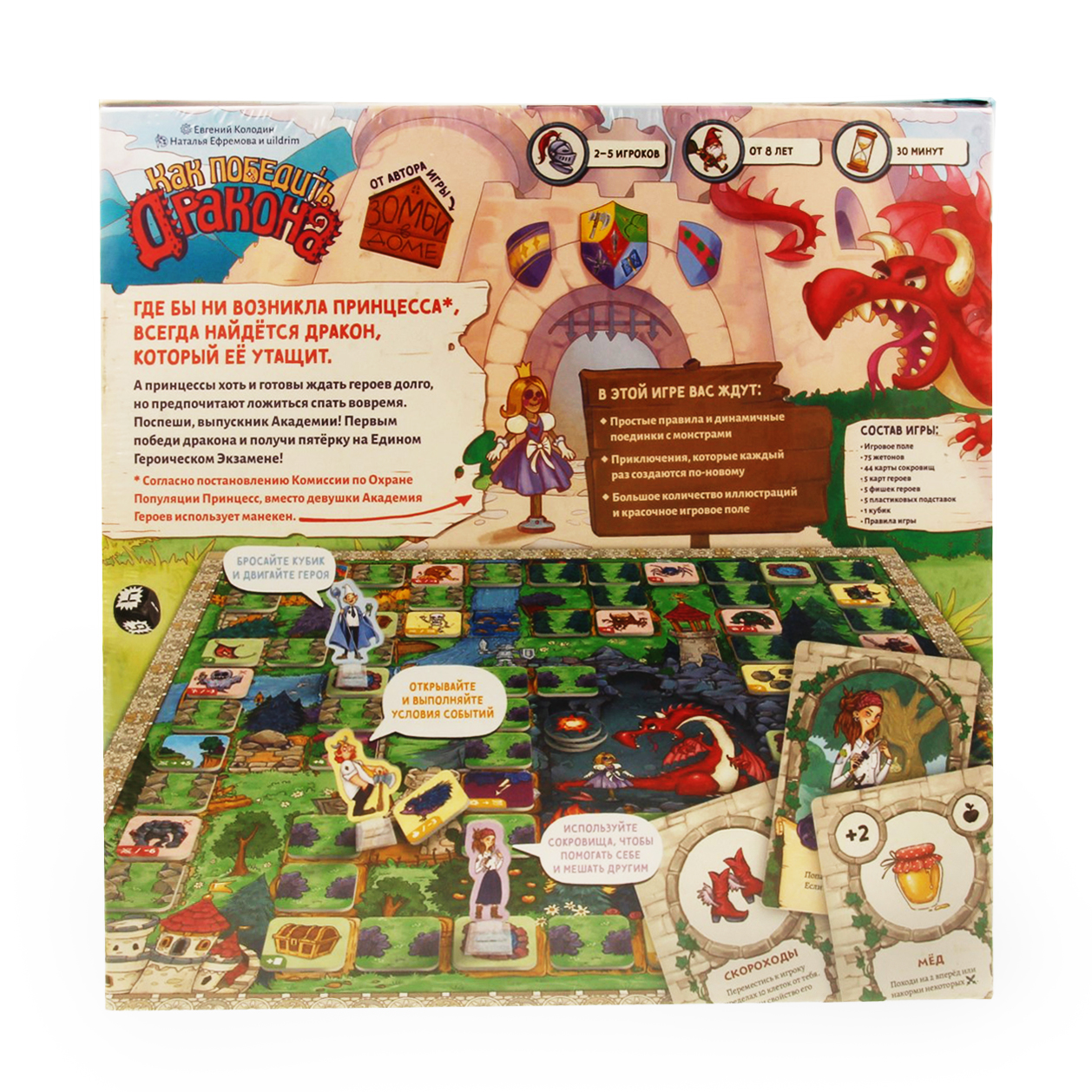 Где бы ни возникла принцесса, всегда найдется дракон, который ее утащит. А принцессы хоть и готовы ждать героев долго, но предпочитают ложиться спать вовремя. Поспеши, выпускник Академии! Первым победи дракона и получи пятёрку на Едином Героическом Экзамене! "Согласно постановлению Комиссии по Охране Популяции Принцесс, вместо девушки Академия Героев использует манекен." Как играть? Вы будете передвигать фигурки своих героев по клеточкам живописного поля. На каждой такой клетке лежит жетон событий, эффект которого применяется сразу же, как ваш персонаж останавливается на нём. Каждый ход начинается с броска кубика, который определит, как далеко по полю вам нужно продвинуться. Как только активируется событие, вы действуете соответственно тому, что оно предполагает. Так, вы можете:
