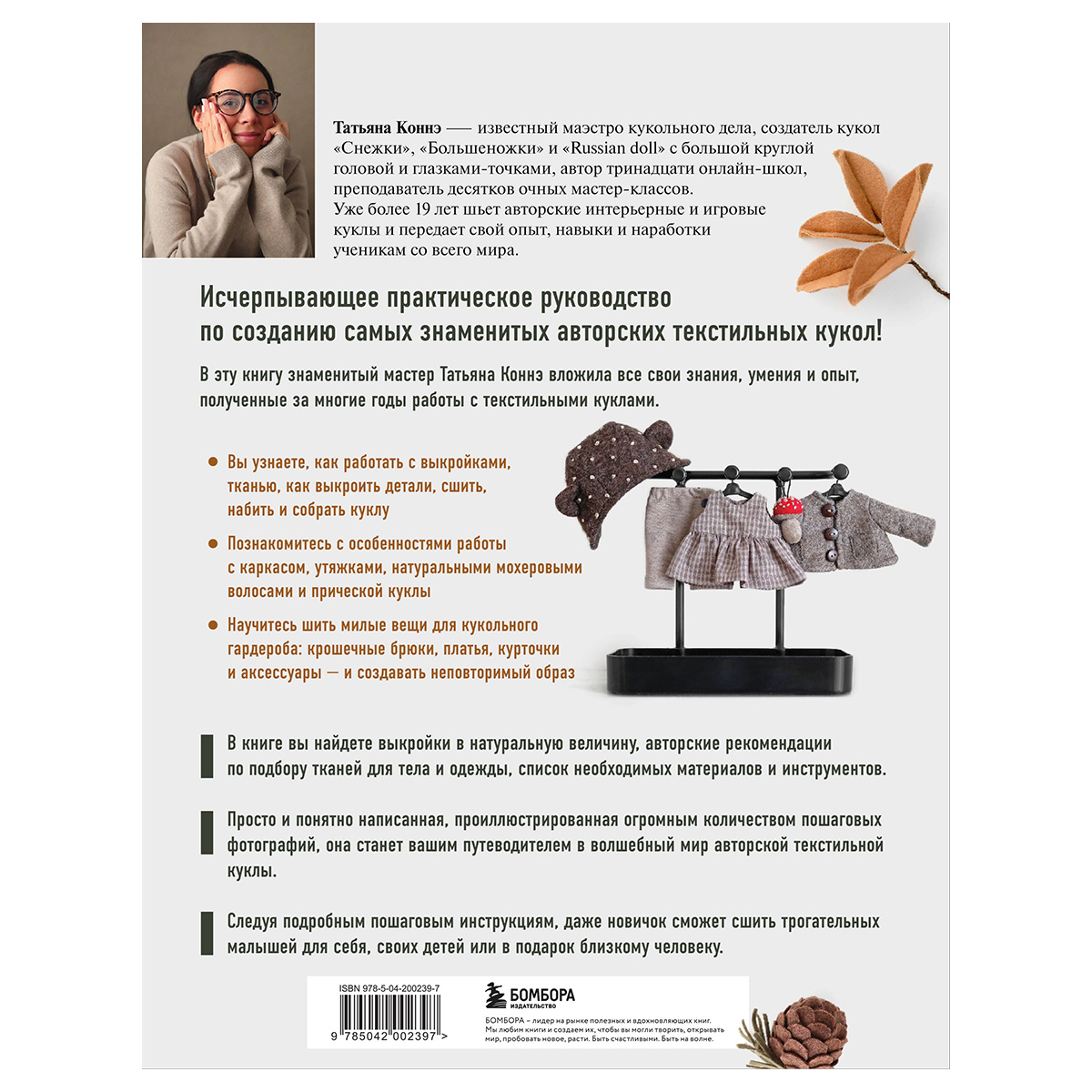 Исчерпывающее практическое руководство по созданию самых знаменитых авторских текстильных кукол! В эту книгу Татьяна Коннэ - знаменитый мастер, придумавший кукол «Снежки», «Большеножки» и «Russian doll» с большой круглой головой и глазками-точками, - вложила все свои знания, умения и опыт, полученные за многие годы работы с текстильными куклами. В книге вы найдете выкройки в натуральную величину, авторские рекомендации по подбору тканей для тела и одежды, список необходимых материалов и инструментов. Просто и понятно написанная, проиллюстрированная огромным количеством пошаговых фотографий, она станет вашим путеводителем в волшебный мир авторской текстильной куклы. Следуя подробным пошаговым инструкциям, даже новичок сможет сшить трогательных малышей для себя, своих детей или в подарок близкому человеку.