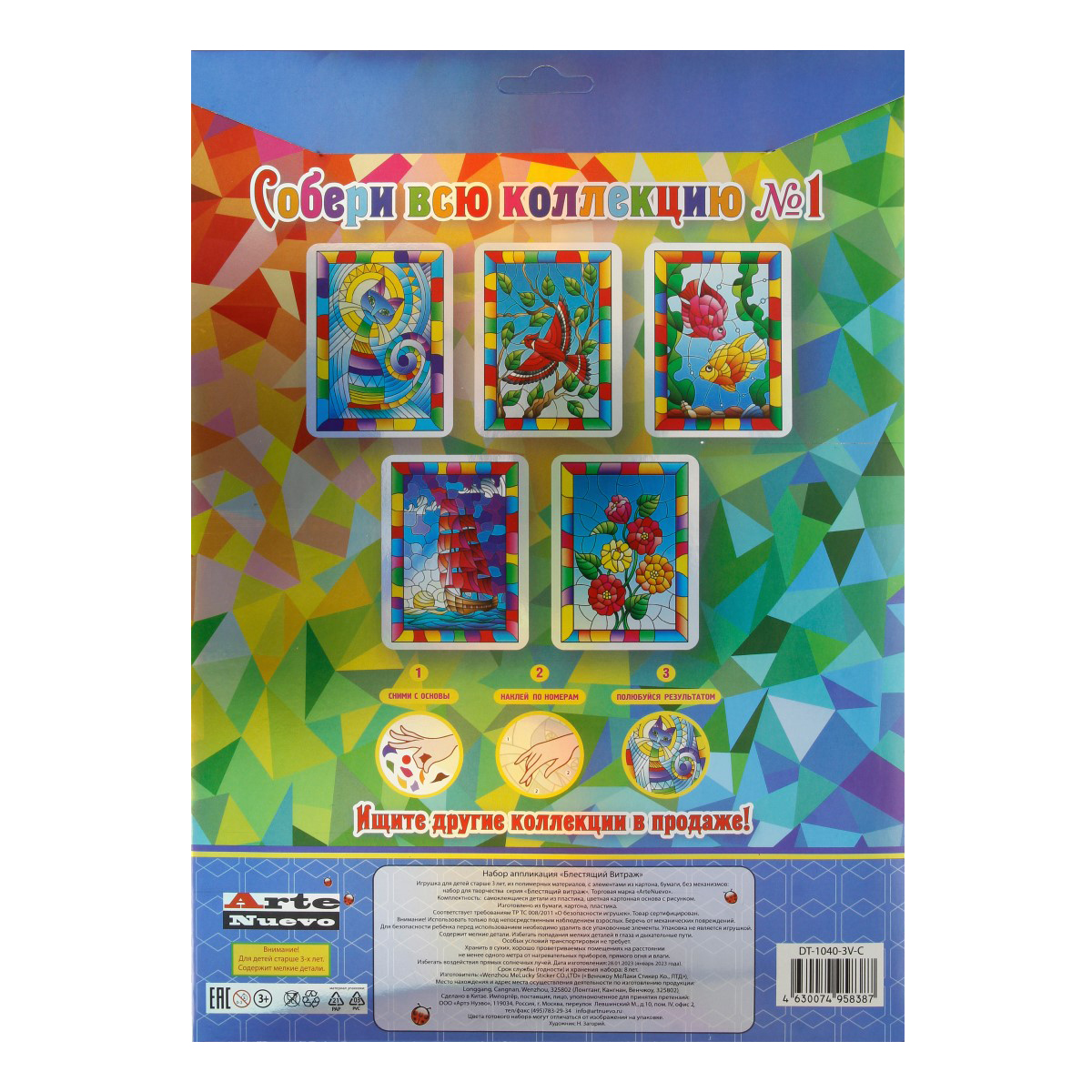 Игрушка-набор для детского творчества "Блестящий витраж" из самоклеящихся деталей. Просто наклейте детали по номерам, получится яркая картина!