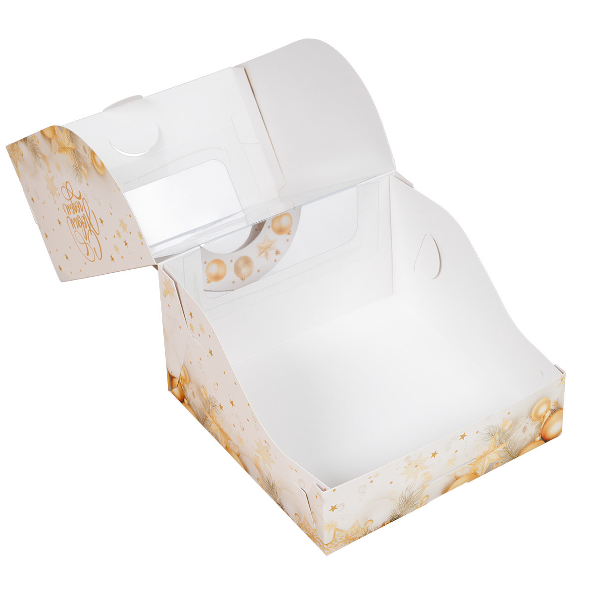 Картонная коробка с окном и небольшими ручками идеально подходит для переноски и презентации бенто тортов, мини-тортов, продуктов. Красивый новогодний дизайн.