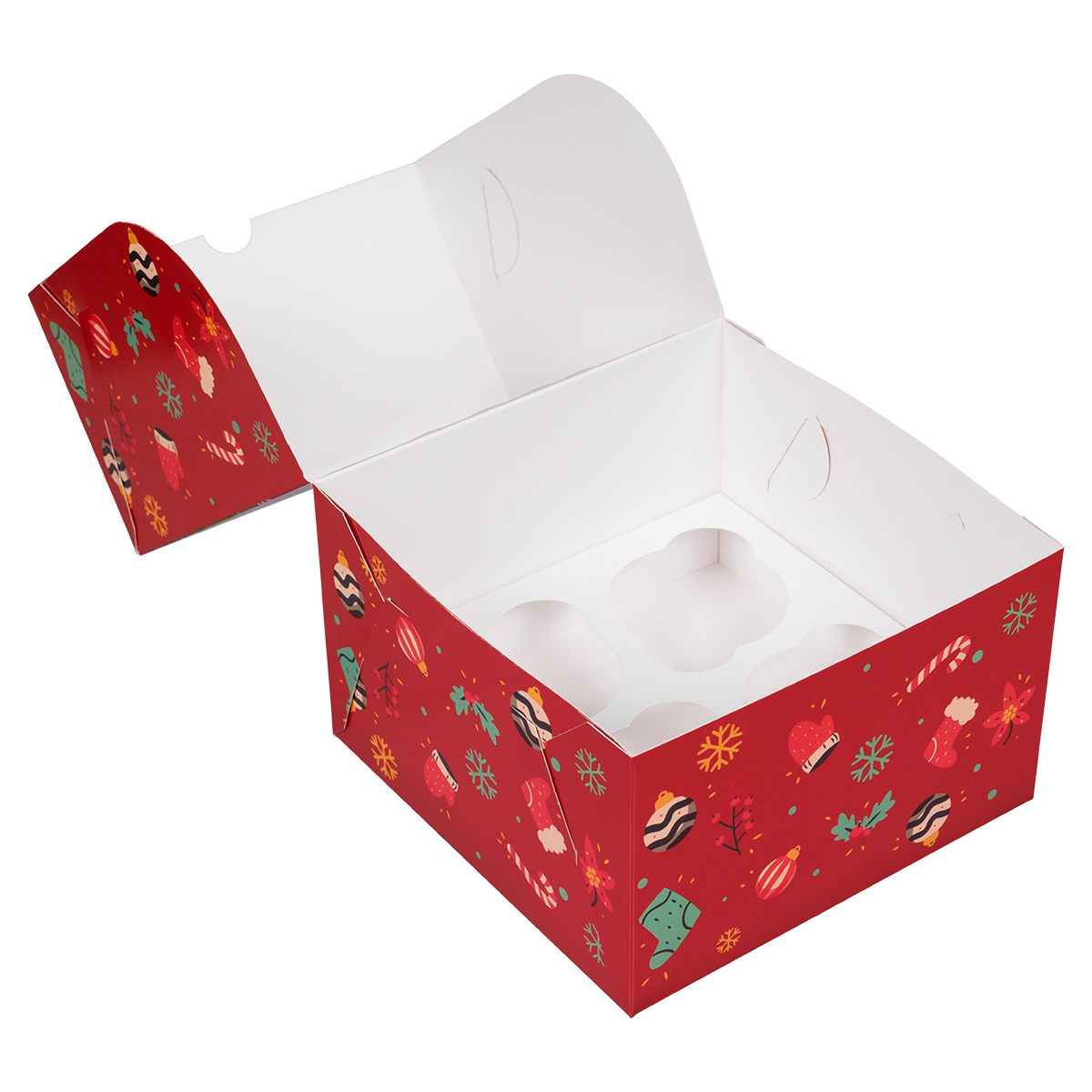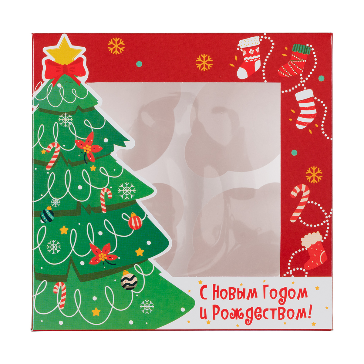 Кондитерская упаковка предназначена для транспортировки и презентации кондитерских изделий. Коробка проста и удобна в сборке. На нее нанесен яркий новогодний принт. На крышке коробки для украшения вырезана фигурная ель. Коробка продается в разобранном виде и предназначена для упаковки 4 капкейков. Диаметр ложемента 6 см.
