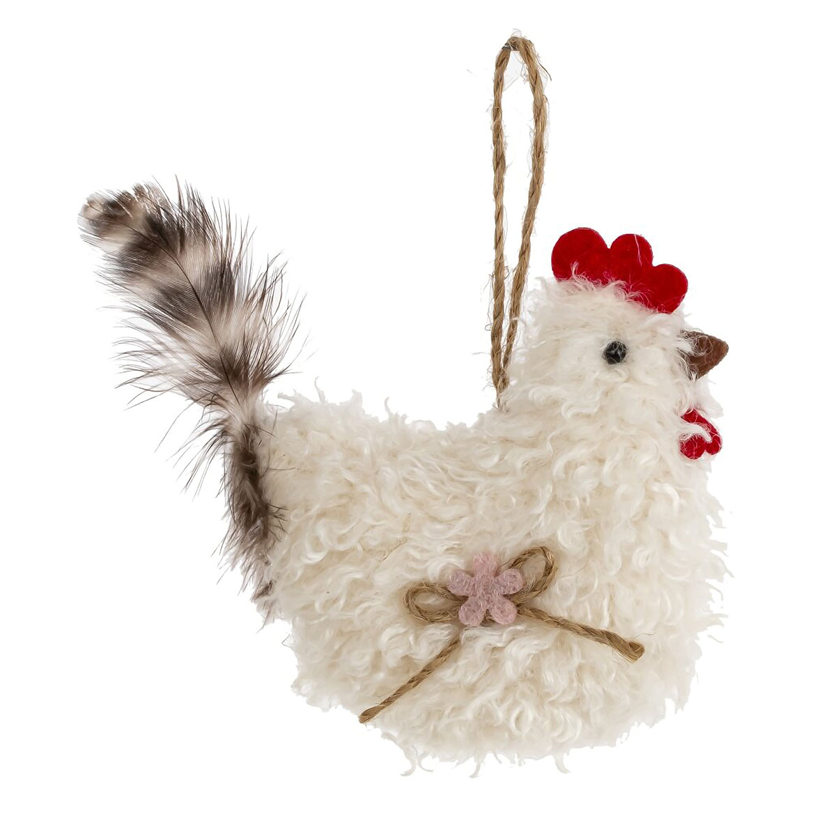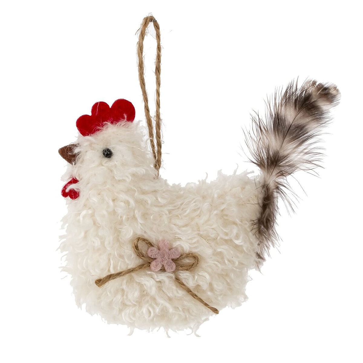 Декоративное подвесное изделие "Курица" выполнено из полимерных и текстильных материалов, создавая уютный и деревенский стиль. Эта очаровательная фигурка украсит любой интерьер, привнесёт тепло и атмосферу уюта. Курица имеет мягкое белоснежное текстильное покрытие, имитирующее пух, а также декоративные элементы, такие как гребешок из фетра, хвост из натуральных перьев и милый бантик из бечёвки с цветком. Благодаря удобной петельке её можно подвесить на стену, новогоднюю ёлку или использовать как элемент весеннего оформления. Отличный выбор для создания оригинального декора в доме или в качестве небольшого подарка. Представлено в двух вариантах.