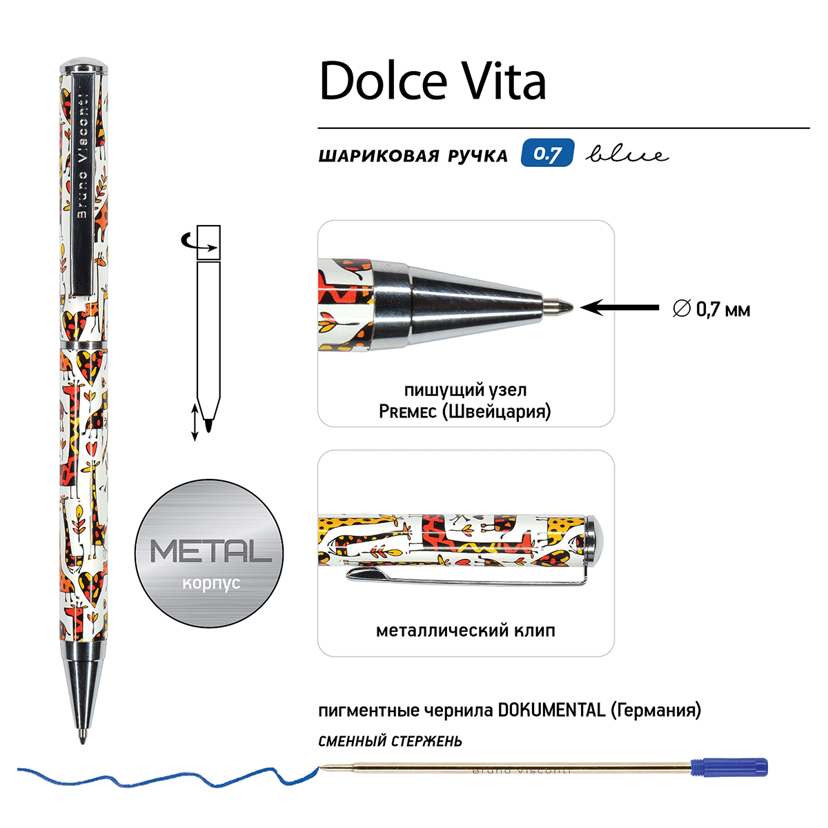 Изящная, стильная подарочная ручка «Dolce Vita» от Bruno Visconti – это элегантное украшение рабочего стола. Яркий дизайн металлического корпуса привлечет к себе внимание и не оставит никого равнодушным.