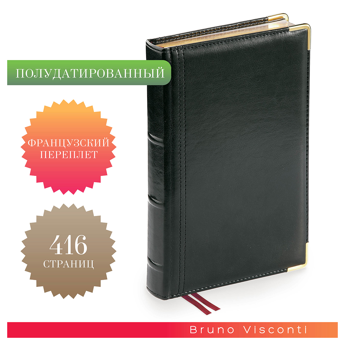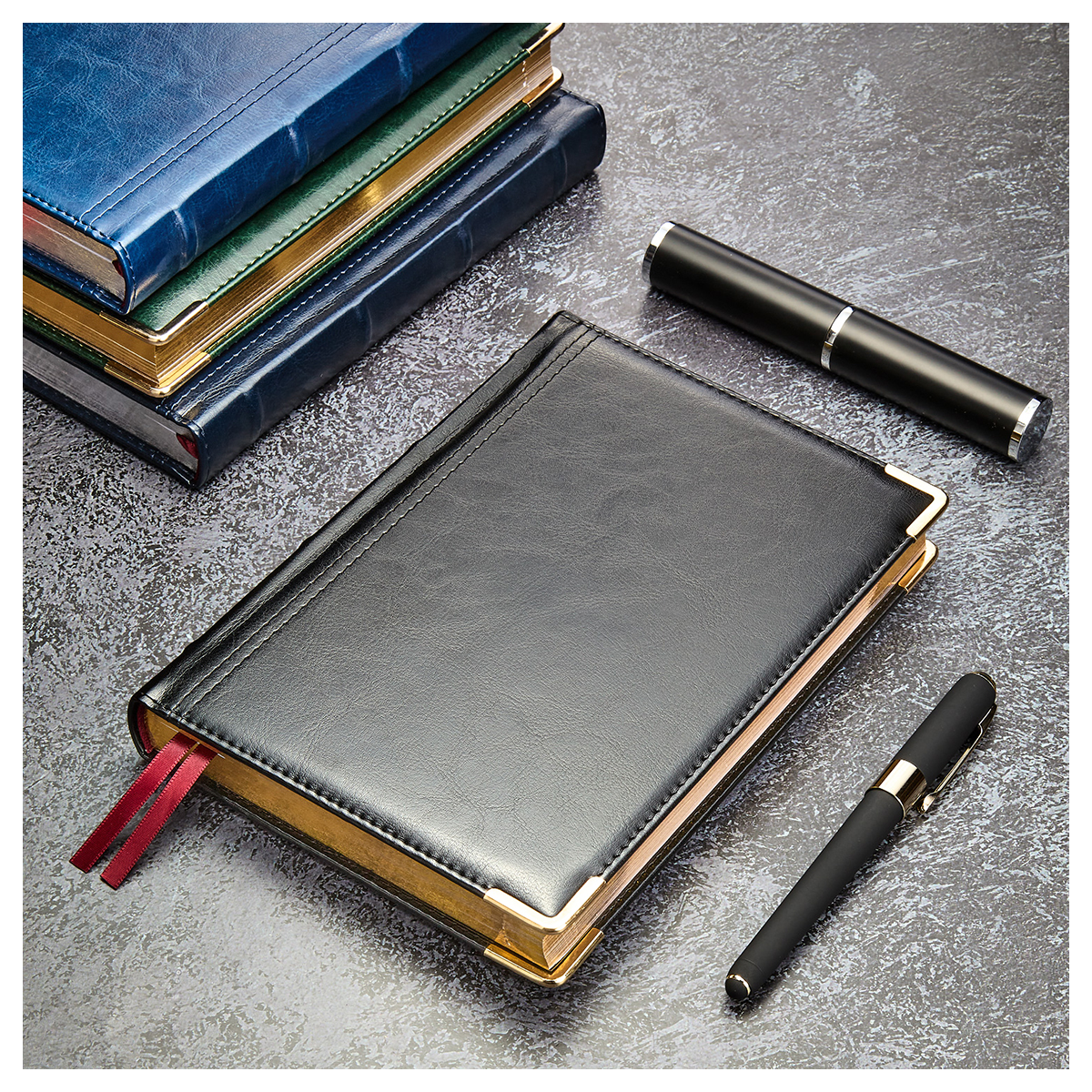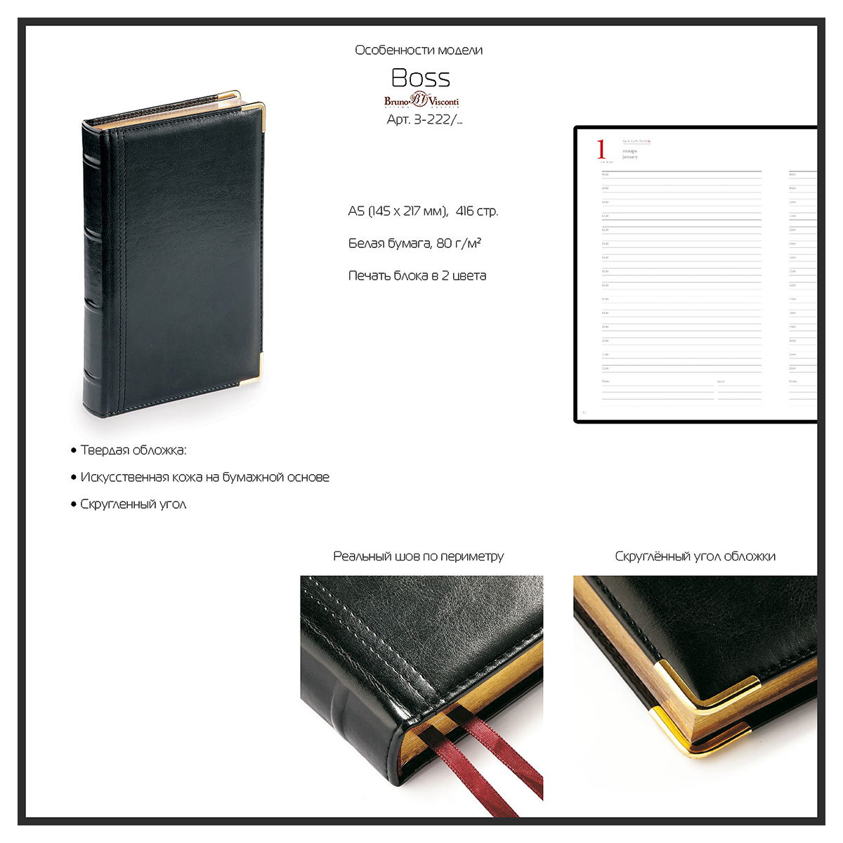 Полудатированный ежедневник "BOSS» формата А5 в твердом переплете – элегантный, стильный деловой аксессуар, отличный помощник в деле планирования рабочего времени. Изящество, статусность и благородство придают ежедневнику: • обложка, выполненная из высококачественной искусственной кожи, которая точно передает фактуру натурального материала; • французский переплет; • золотые металлические уголки обложки; • золотой обрез блока; • декоративная строчка по периметру в тон обложки; • двойное ляссе и перфорированные уголки внутреннего блока для удобства навигации. Внутренний блок с увеличенным количеством страниц – 416, изготовлен из белой бумаги плотностью 80 г/кв.м. Он содержит в т.ч. справочную информацию. .