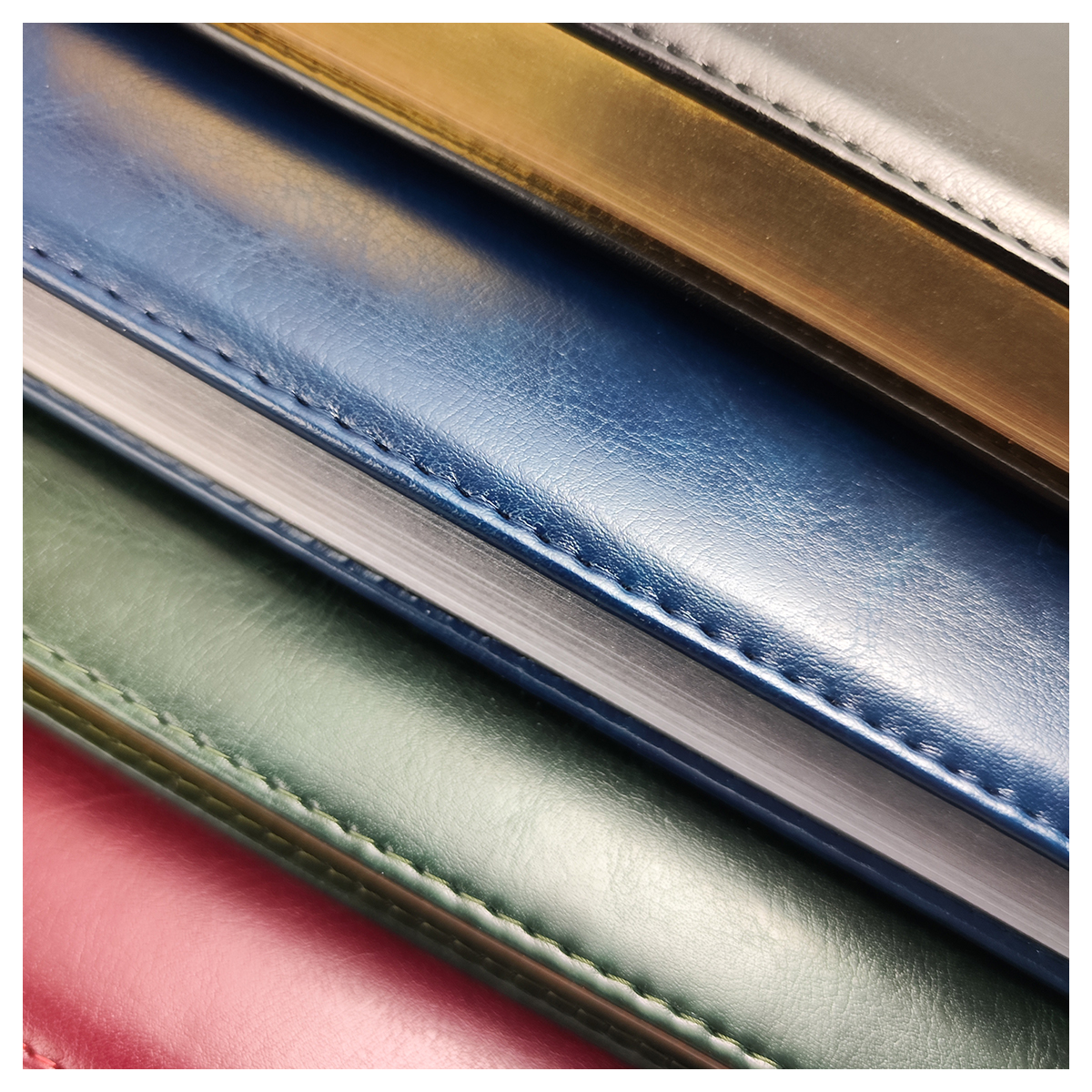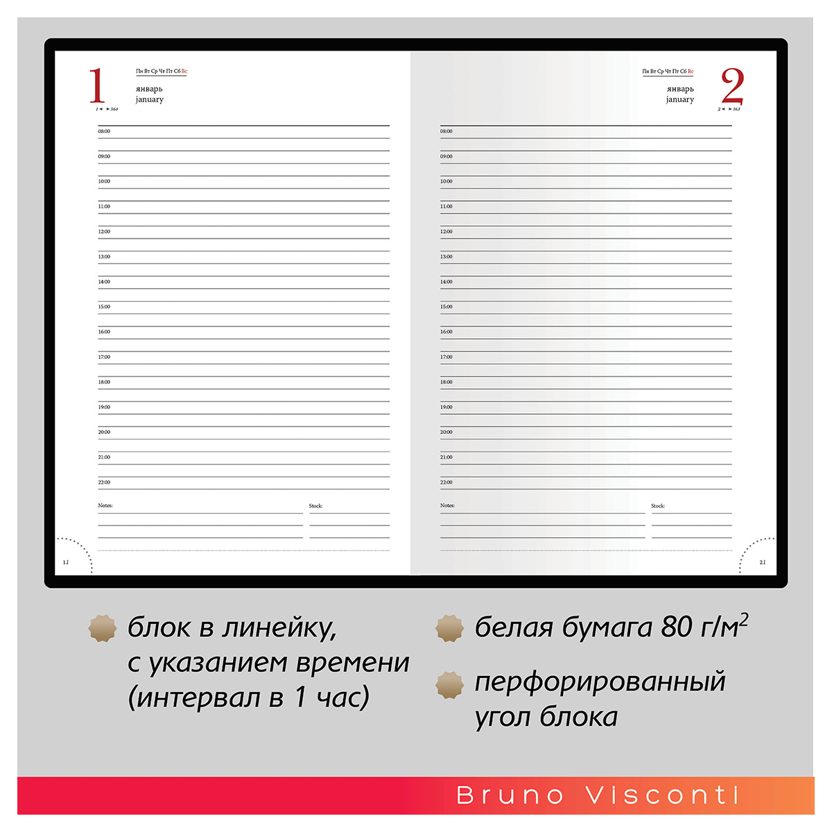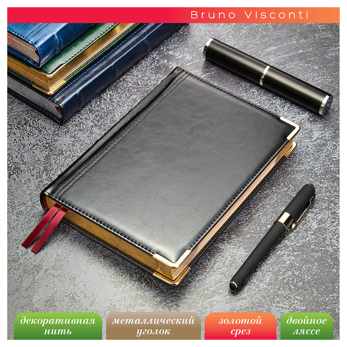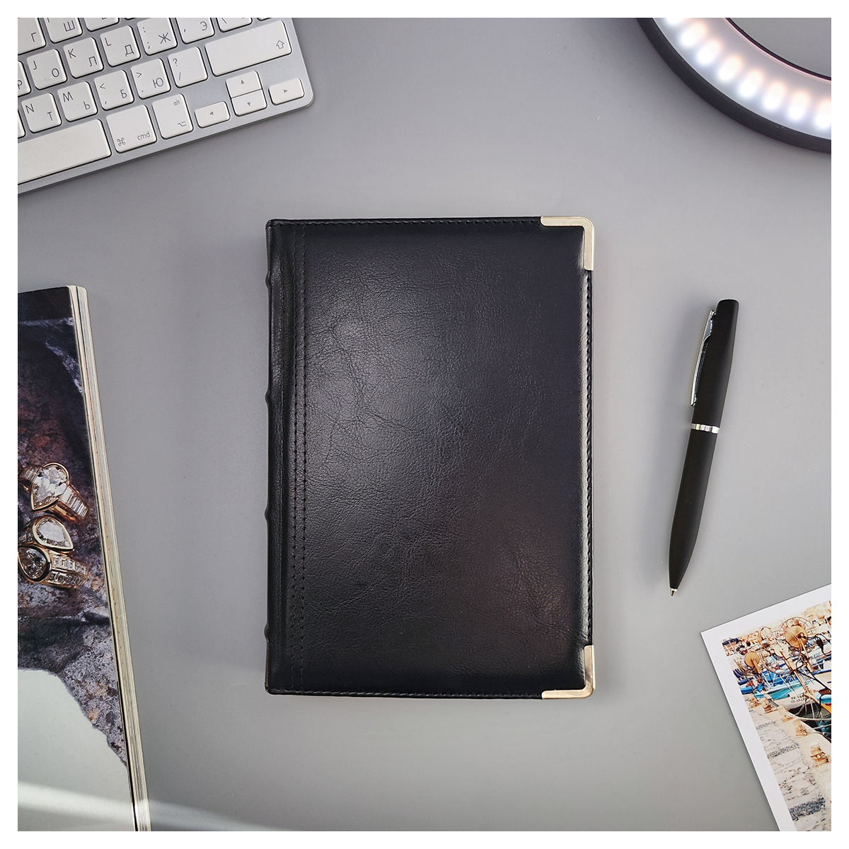 Полудатированный ежедневник "BOSS» формата А5 в твердом переплете – элегантный, стильный деловой аксессуар, отличный помощник в деле планирования рабочего времени. Изящество, статусность и благородство придают ежедневнику: • обложка, выполненная из высококачественной искусственной кожи, которая точно передает фактуру натурального материала; • французский переплет; • золотые металлические уголки обложки; • золотой обрез блока; • декоративная строчка по периметру в тон обложки; • двойное ляссе и перфорированные уголки внутреннего блока для удобства навигации. Внутренний блок с увеличенным количеством страниц – 416, изготовлен из белой бумаги плотностью 80 г/кв.м. Он содержит в т.ч. справочную информацию. .