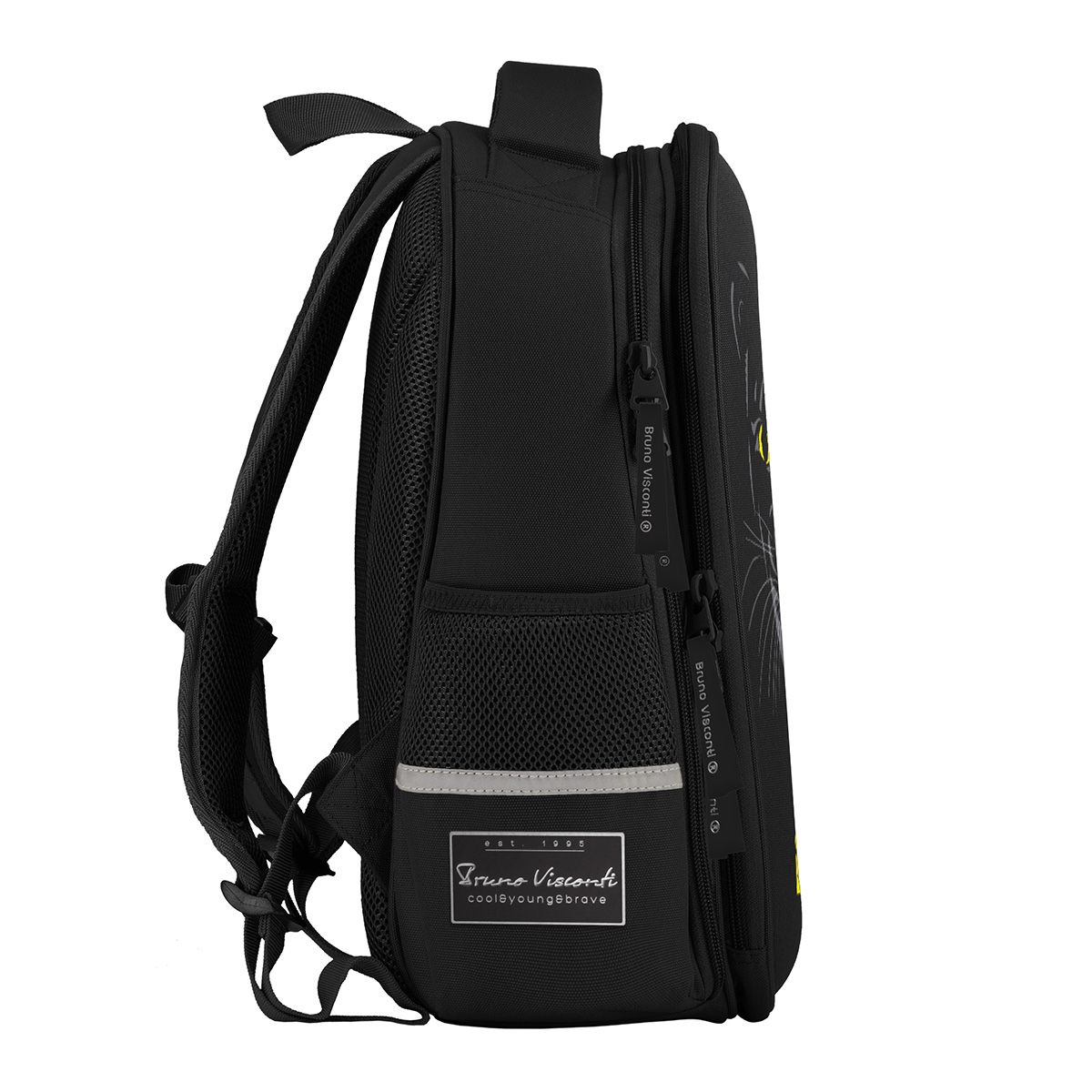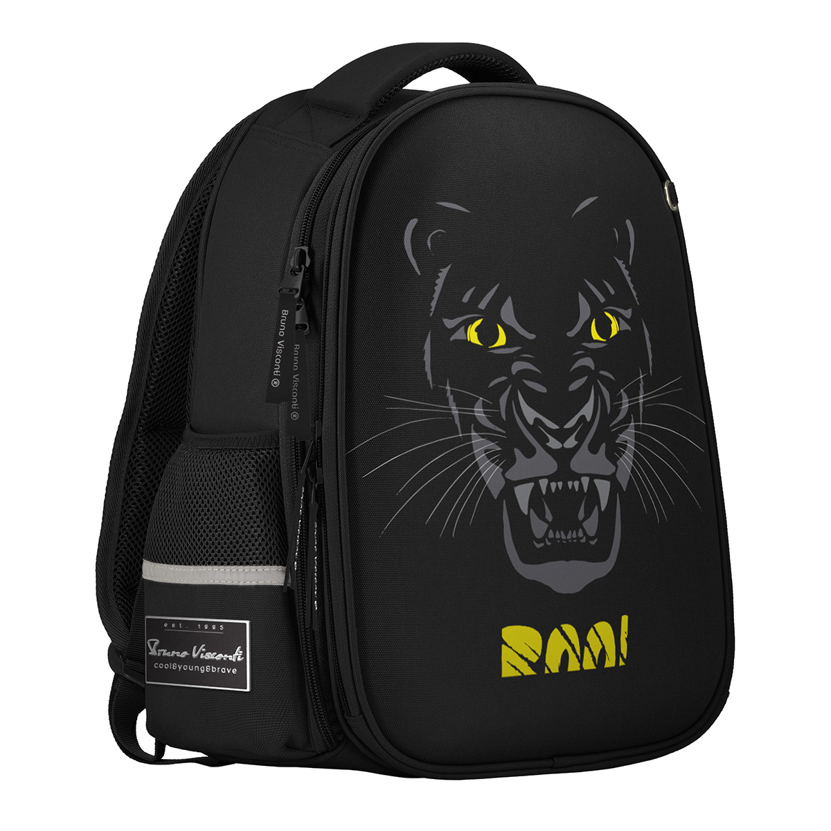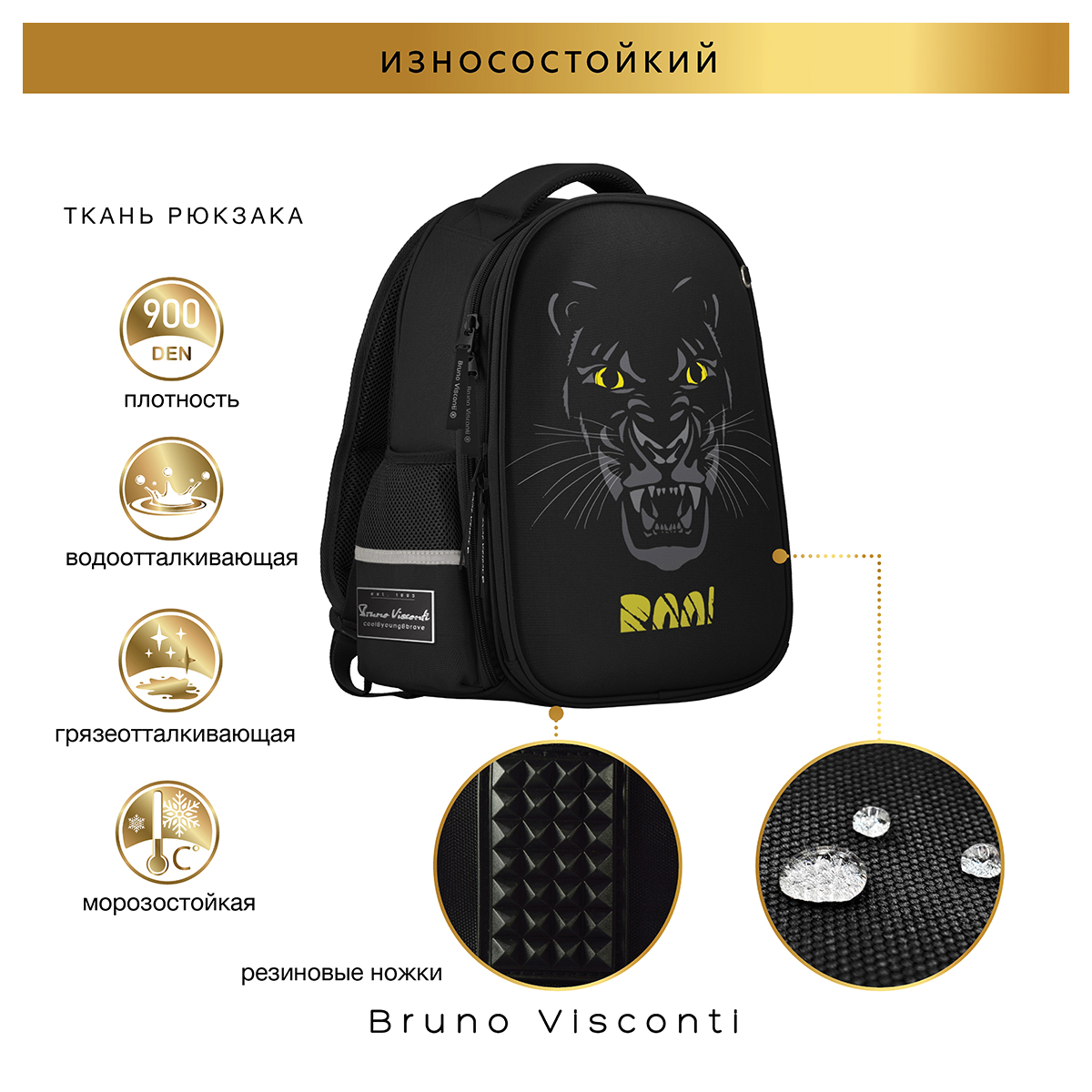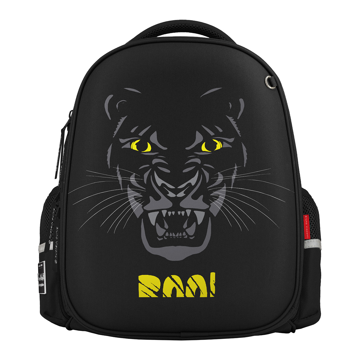 Рюкзак школьный «ВЗГЛЯД ЗВЕРЯ.ПАНТЕРА» ТМ Bruno Visconti облегченный, с эргономичной спинкой. Для его производства использовалась ткань premium качества: водонепроницаемая, морозостойкая, с повышенной износостойкостью, грязеотталкивающая плотностью 900 DEN. Благодаря сложнейшим современным технологиям нанесения на ткань рюкзак украшает авторский дизайн, соответствующий последним трендам. Плотная фирменная подкладка BRUNO VISCONTI идеально сочетается с дизайном и цветом самого рюкзака. Двунаправленные реверсивные надежные 8-мм молнии с 5-см пуллером на замках позволяют легко открывать и закрывать рюкзак. Комфорт и функциональность обеспечивают: эргономичная, вентилируемая, с анатомическими подушечками спинка; регулируемые лямки анатомической формы с застежкой на клипсе, дополнительно участвующие в правильном распределении веса рюкзака; ручка-подвес из надежного материала, устойчивого к истиранию с усиленным креплением, выдерживающая большие нагрузки; мягкая эргономичная ручка; четыре светоотражающих элемента; кольцо для брелока; усиленное дно, оснащенное резиновыми ножками и защищающее от загрязнения дно рюкзака; отделение с органайзером на молнии и карманом-сеточкой; два боковых кармана для термоса или бутылки с водой; отделение, состоящее из трех частей с двумя разделителями, фиксирующим ремнем и дополненное карманом на молнии для карточки.