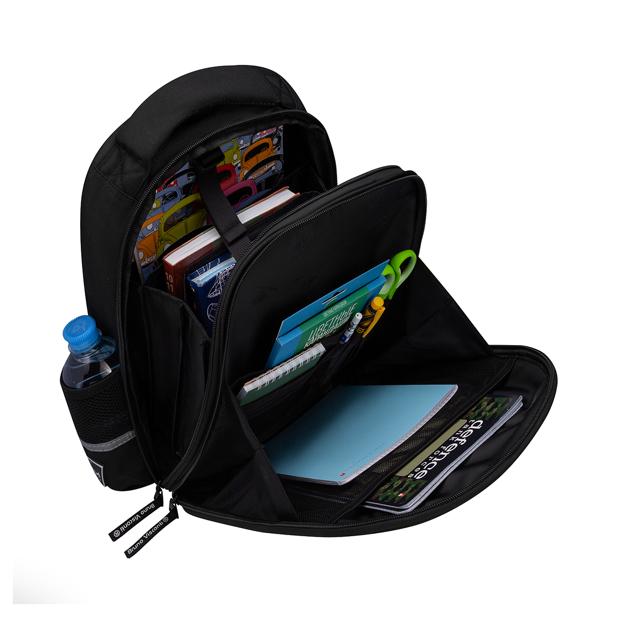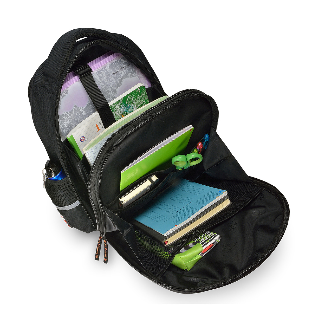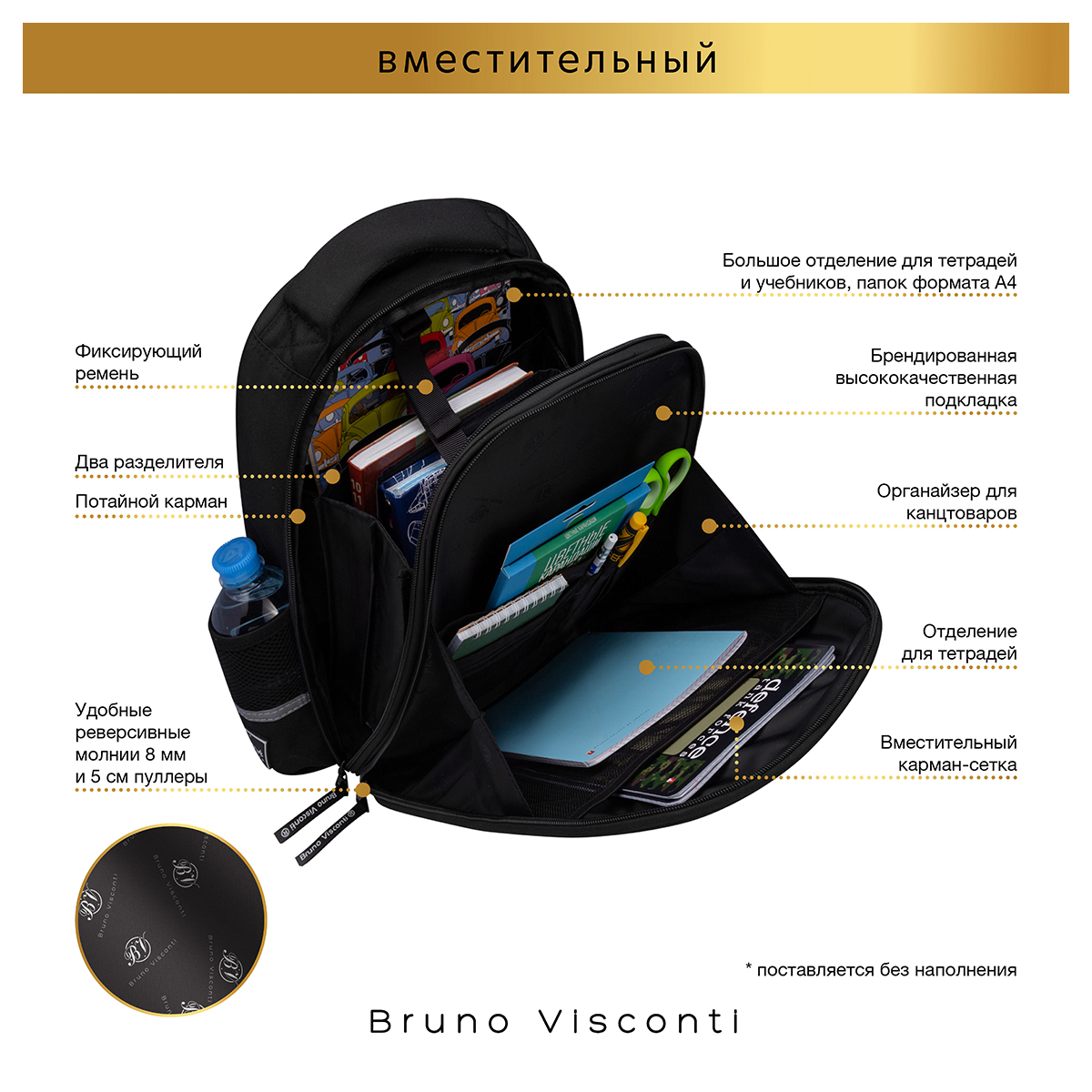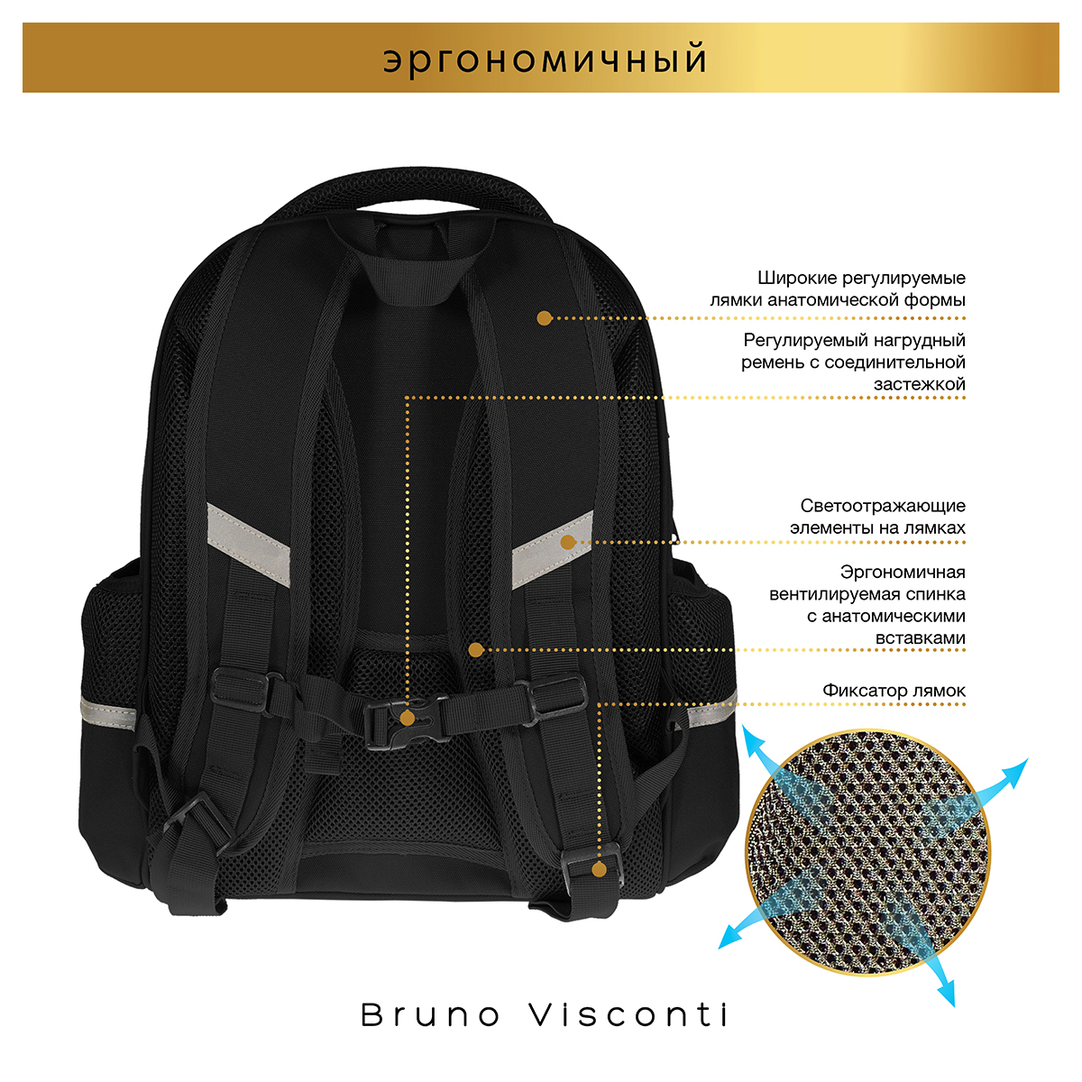 Рюкзак школьный «ВЗГЛЯД ЗВЕРЯ.ПАНТЕРА» ТМ Bruno Visconti облегченный, с эргономичной спинкой. Для его производства использовалась ткань premium качества: водонепроницаемая, морозостойкая, с повышенной износостойкостью, грязеотталкивающая плотностью 900 DEN. Благодаря сложнейшим современным технологиям нанесения на ткань рюкзак украшает авторский дизайн, соответствующий последним трендам. Плотная фирменная подкладка BRUNO VISCONTI идеально сочетается с дизайном и цветом самого рюкзака. Двунаправленные реверсивные надежные 8-мм молнии с 5-см пуллером на замках позволяют легко открывать и закрывать рюкзак. Комфорт и функциональность обеспечивают: эргономичная, вентилируемая, с анатомическими подушечками спинка; регулируемые лямки анатомической формы с застежкой на клипсе, дополнительно участвующие в правильном распределении веса рюкзака; ручка-подвес из надежного материала, устойчивого к истиранию с усиленным креплением, выдерживающая большие нагрузки; мягкая эргономичная ручка; четыре светоотражающих элемента; кольцо для брелока; усиленное дно, оснащенное резиновыми ножками и защищающее от загрязнения дно рюкзака; отделение с органайзером на молнии и карманом-сеточкой; два боковых кармана для термоса или бутылки с водой; отделение, состоящее из трех частей с двумя разделителями, фиксирующим ремнем и дополненное карманом на молнии для карточки.