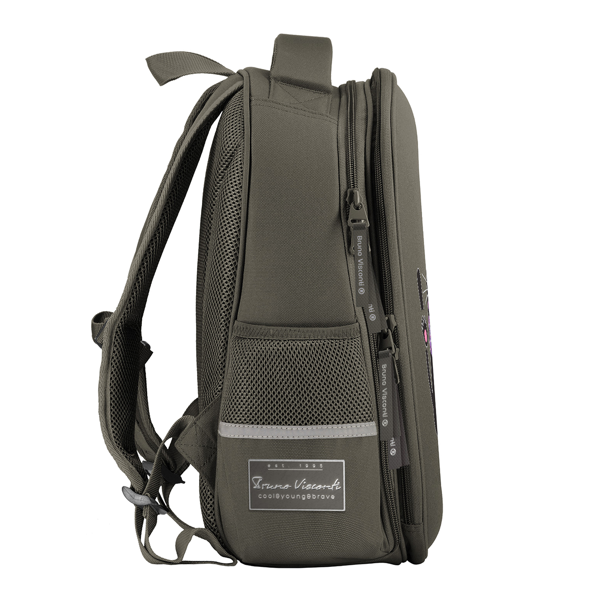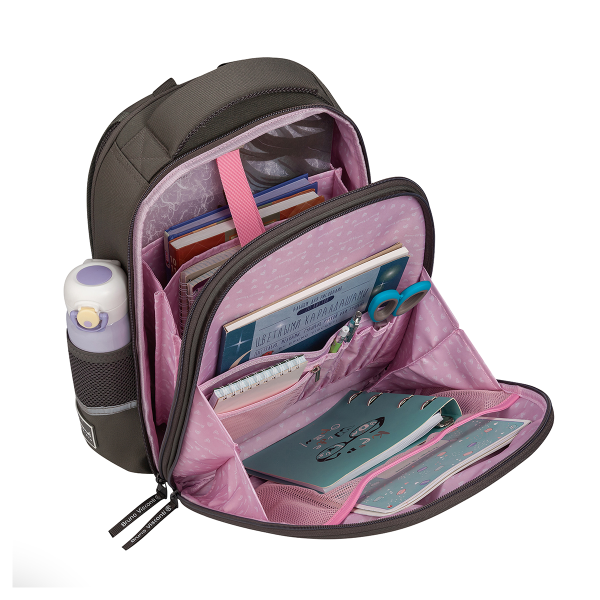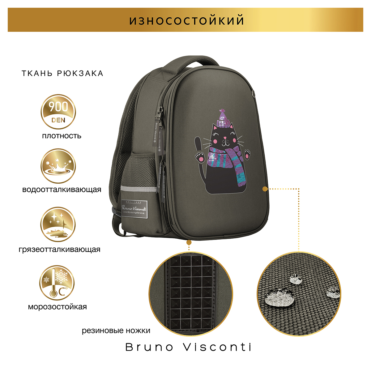 Рюкзак школьный «SWEET CAT» ТМ Bruno Visconti имеет жесткий корпус: передняя и боковые стенки выполнены из усиленного материала, что обеспечивает эффект «капсулы». Для его производства использовалась ткань premium качества: водонепроницаемая, морозостойкая, с повышенной износостойкостью, грязеотталкивающая плотностью 900 DEN.