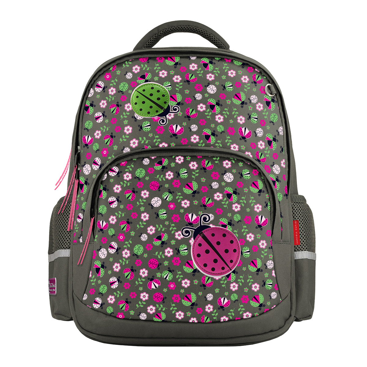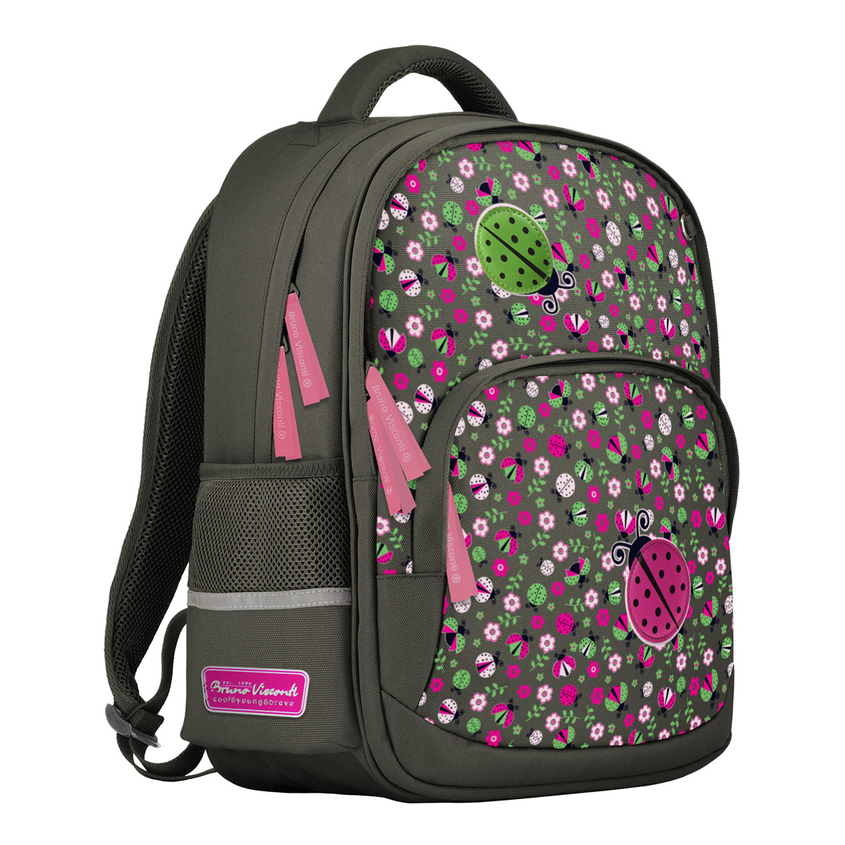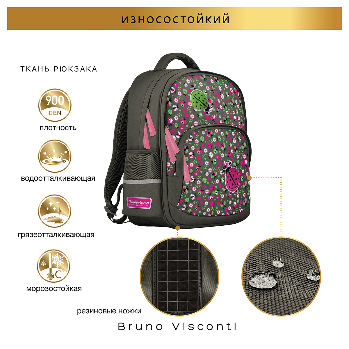 Рюкзак школьный серии Junior «БОЖЬИ КОРОВКИ.ЦВЕТЫ» ТМ BRUNO VISCONTI отличается мягкими боковыми и передними стенками при эргономичной посадке. Для его производства использовалась ткань premium качества: водонепроницаемая, морозостойкая, с повышенной износостойкостью, грязеотталкивающая плотностью 900 DEN. Благодаря сложнейшим современным технологиям нанесения на ткань рюкзак украшает авторский дизайн, соответствующий последним трендам. Плотная фирменная подкладка BRUNO VISCONTI идеально сочетается с дизайном и цветом самого рюкзака. Двунаправленные реверсивные надежные 8-мм молнии с 5-см пуллером на замках позволяют легко открывать и закрывать рюкзак. Вместительный рюкзак имеет большое отделение для тетрадей и учебников с потайным карманом и отделение для тетрадей с органайзером для канцтоваров. Комфорт и функциональность обеспечивают: эргономичная, вентилируемая, с анатомическими вставками спинка; широкие регулируемые лямки анатомической формы; большое отделение для тетрадей и учебников; отделение для тетрадей с органайзером; ручка-подвес из надежного материала, устойчивого к истиранию с усиленным креплением, выдерживающая большие нагрузки; мягкая эргономичная ручка; по два светоотражающих элемента на лямках и боковых карманах; усиленное дно рюкзака оснащено резиновыми ножками, защищающими от загрязнения и влаги; кольцо для брелока/бейджика; фиксатор лямок; потайной карман для магнитной карты; два боковых кармана. Размеры: 30х40х19 см, вес - 800 г, объём - 22,8 л.