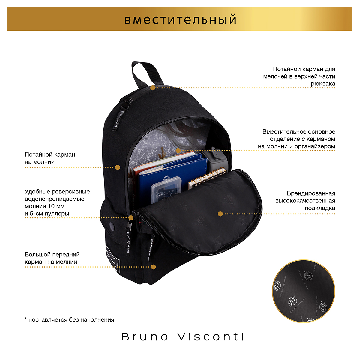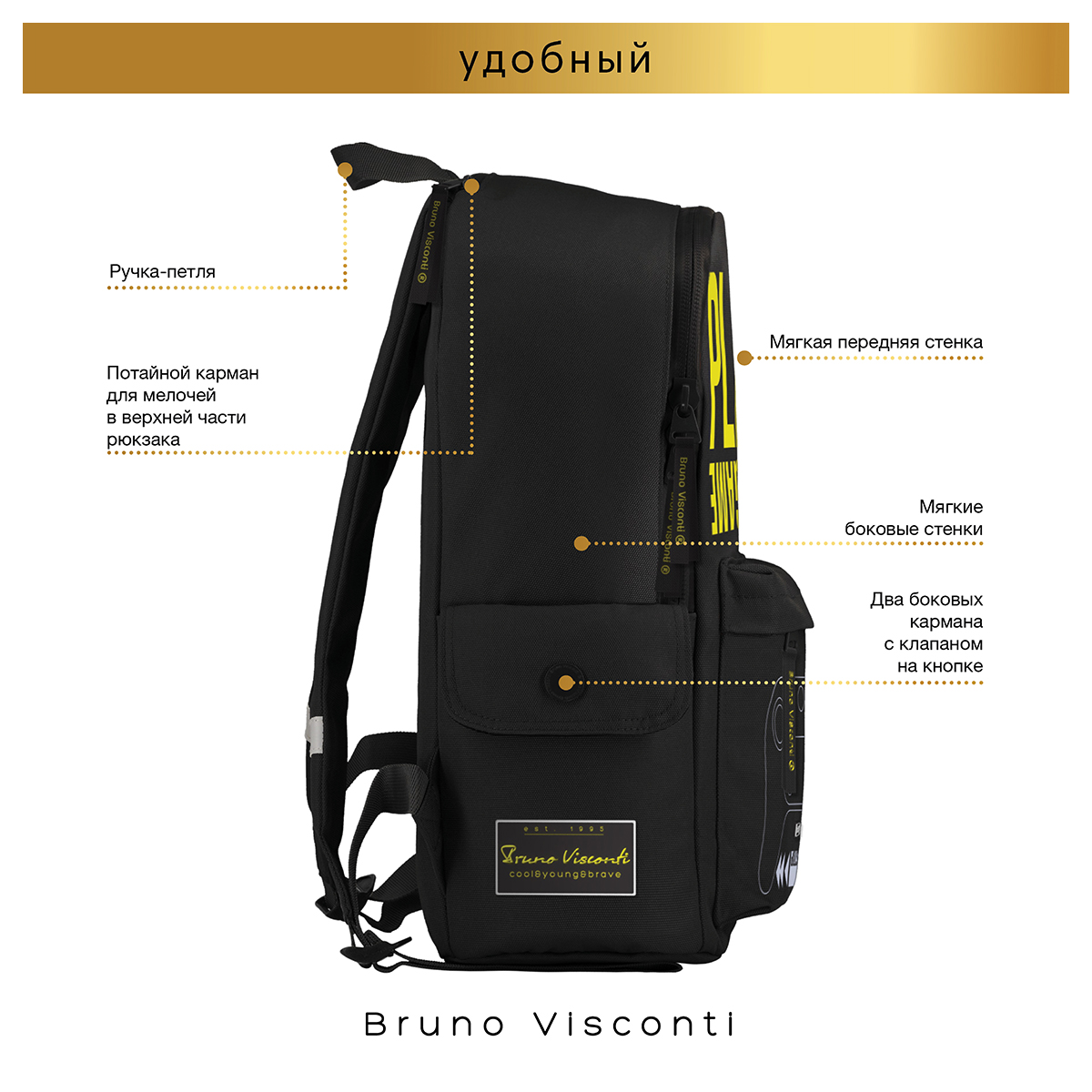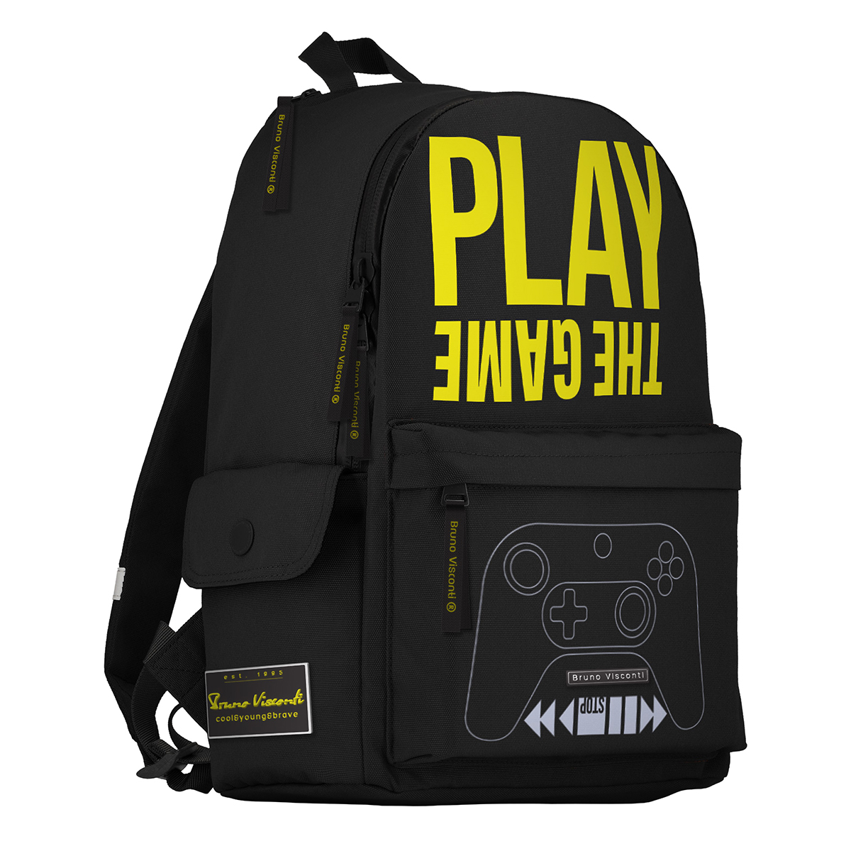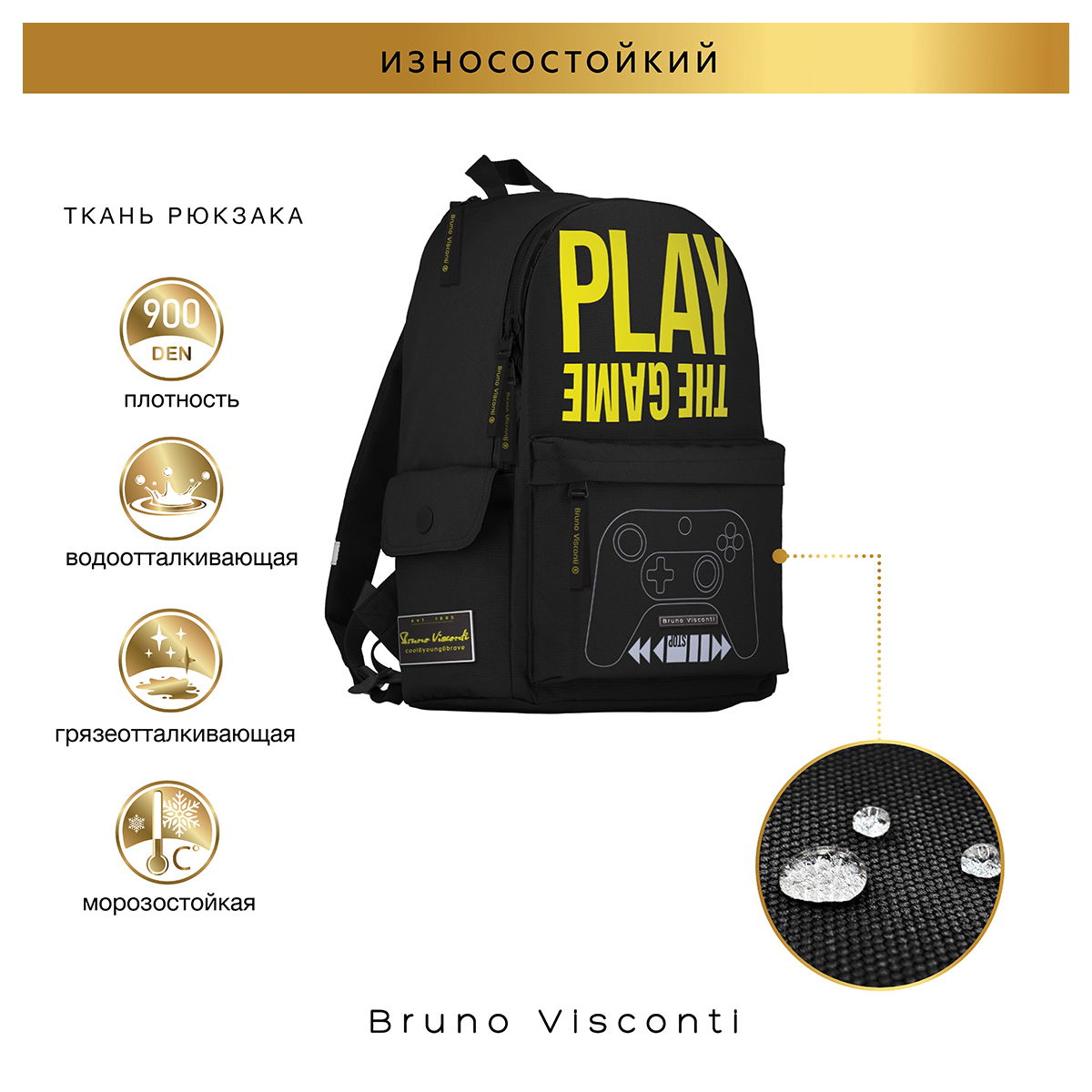 В производстве рюкзака «PLAY THE GAME NOW» от Bruno Visconti использовались сложнейшие современные технологии нанесения на ткань. Рюкзак износостойкий и прослужит долго благодаря водонепроницаемой, морозостойкой и грязеотталкивающей ткани плотностью 900 D. Надежные, ВОДОНЕПРОНИЦАЕМЫЕ двунаправленные реверсивные 10-мм молнии с 5-см пуллером на замках удобны в эксплуатации, позволяют легко открывать и закрывать рюкзак. Износостойкая фирменная подкладка BRUNO VISCONTI тщательно подобрана и сочетаетя с дизайном и цветом рюкзака. Комфорт и функциональность рюкзаку обеспечивают: мягкая спинка; широкие регулируемые лямки с усиленным креплением и светоотражающими элементами; ручка-петля; фронтальный карман на молнии, два боковых кармана с клапаном на кнопке, верхний потайной карман на молнии для мелочей; основное отделение с карманом на молнии и двумя открытыми карманами, боковой потайной карман. Размеры: 30х40х17 см, вес - 570 г, объём - 21 л.