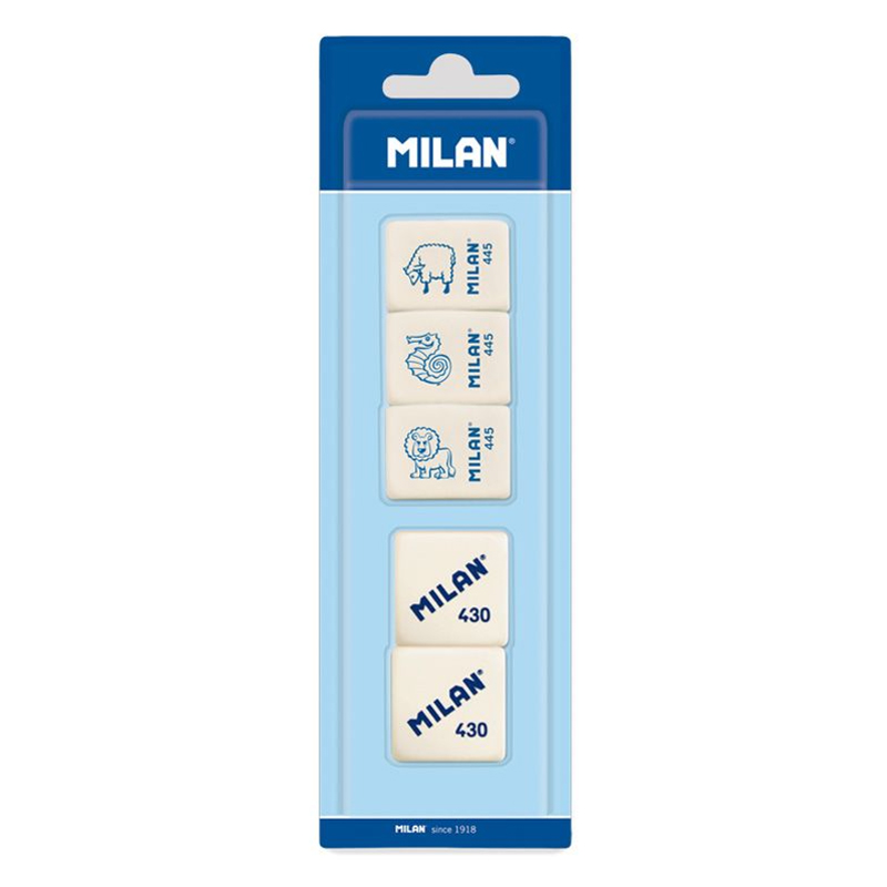 Набор ластиков MILAN из 5 штук произведенных из мягкого синтетического каучука. Ластики мягко стирают чернографитный штрих с любого типа бумаги, не крошатся, не травмируют бумагу и не оставляют следов. 445 - мягкий синтетический каучуковый ластик прямоугольной формы. Может использоваться для стирания широкого спектра штрихов графитного карандаша со всех типов бумаги. С детскими рисунками и в ассортименте цветов: белый и розовый. Размер ластика: 3,1 x 2,3 x 0,9 см. 430 - мягкий синтетический резиновый ластик. Может использоваться для стирания широкого спектра штрихов графитного карандаша со всех типов бумаги. Размер ластика: 2,8 x 2,8 x 1,3 см.