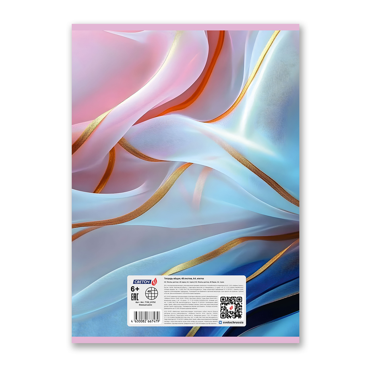 Тетрадь общая А4 формата, 48 листов можно использовать для скетчинга, для записей задач, желаний и рецептов, на работе и в школе. Внутренний блок изготовлен из качественной офсетной бумаги плотностью 65 г/кв. м, 100% белизны, обложка из мелованного картона плотностью 190 г/кв. м. Линовка - клетка. Вид скрепления - скоба.