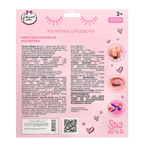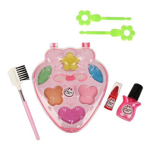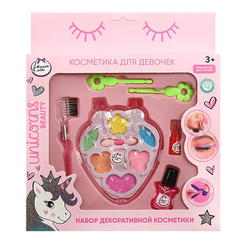 Набор косметики для девочек ТМ «Милая леди» непременно понравится маленькой моднице: - футляр с тенями для век 6-ти цветов: жёлтый, розовый, оранжевый, зелёный, светло-розовый, голубой - аппликатор для нанесения макияжа - щёточка для бровей - помада для губ красного цвета - лак для ногтей розового цвета: снимается одним движением - 2 заколки - безопасно для детей - одобрено дерматологами