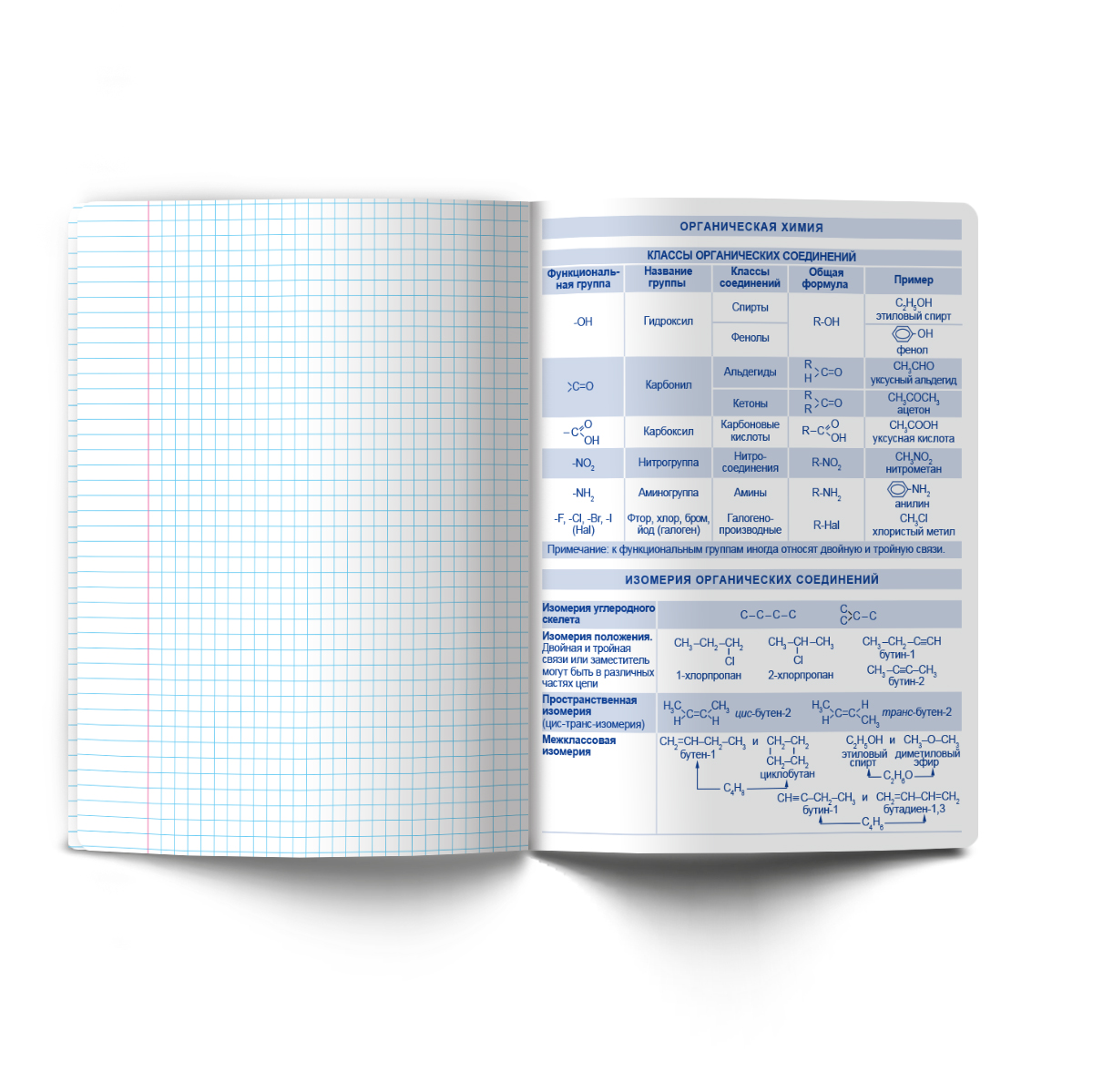 Предметная тетрадь А5 формата, 48 листов предназначена для учащихся средних и старших классов. Внутренний блок изготовлен из качественной офсетной бумаги плотностью 60 г/кв. м, 90% белизны, обложка из мелованного картона плотностью 190 г/кв. м. Линовка - клетка, красные поля. Вид скрепления - скоба. Тетради имеют закругленные уголки. Справочная информация по предмету на форзацах.
