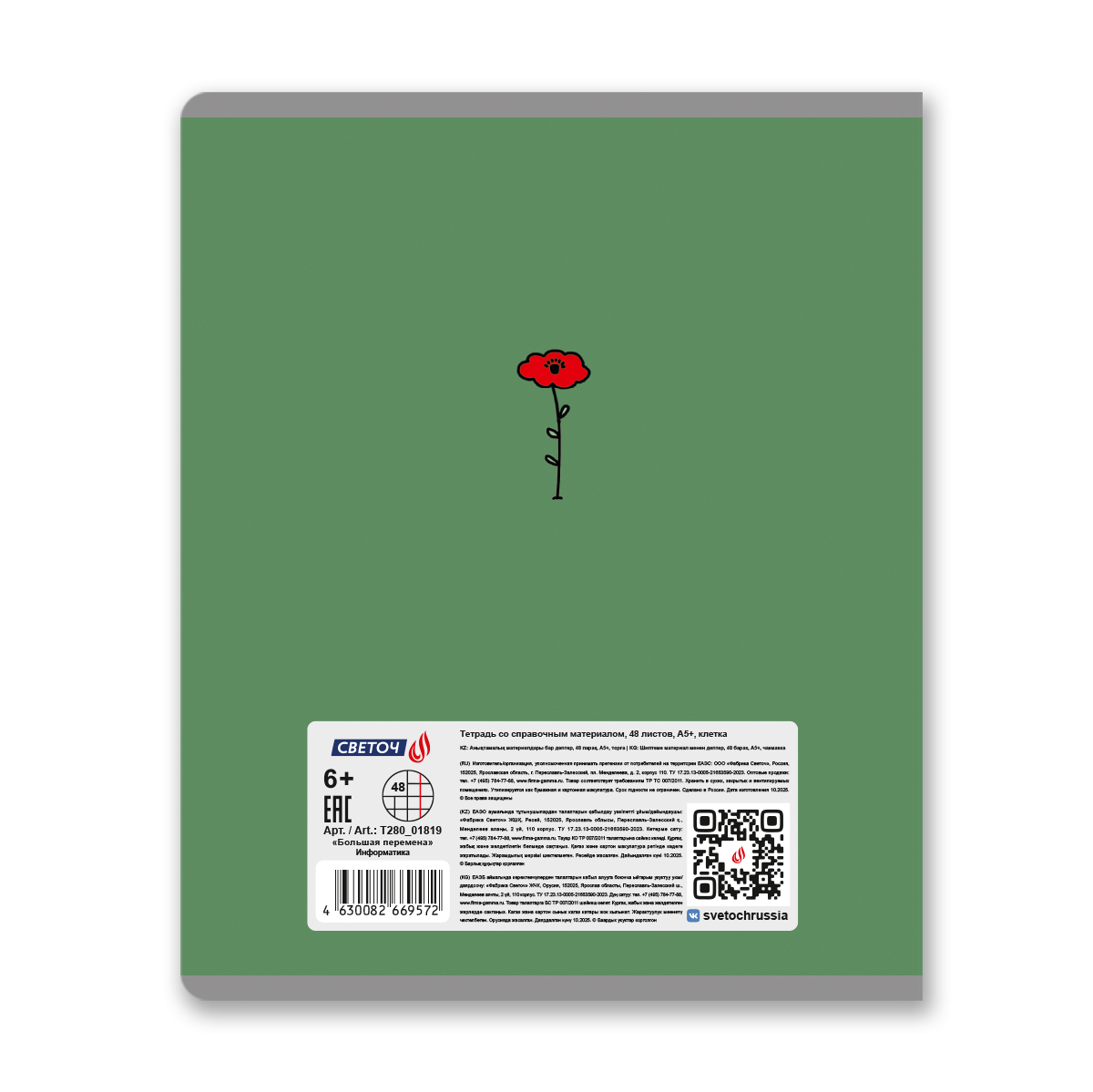 Предметная тетрадь А5 формата, 48 листов предназначена для учащихся средних и старших классов. Внутренний блок изготовлен из качественной офсетнойбумаги плотностью 65 г/кв. м, 100% белизны, обложка из мелованного картона плотностью 190 г/кв. м. Обложка дополнена спецэффектом в виде выборочного лака. Линовка - клетка, красные поля. Вид скрепления - скоба. Тетради имеют закругленные уголки, титульный лист. Справочная информация по предмету прикладные листы + форзац задней обложки.