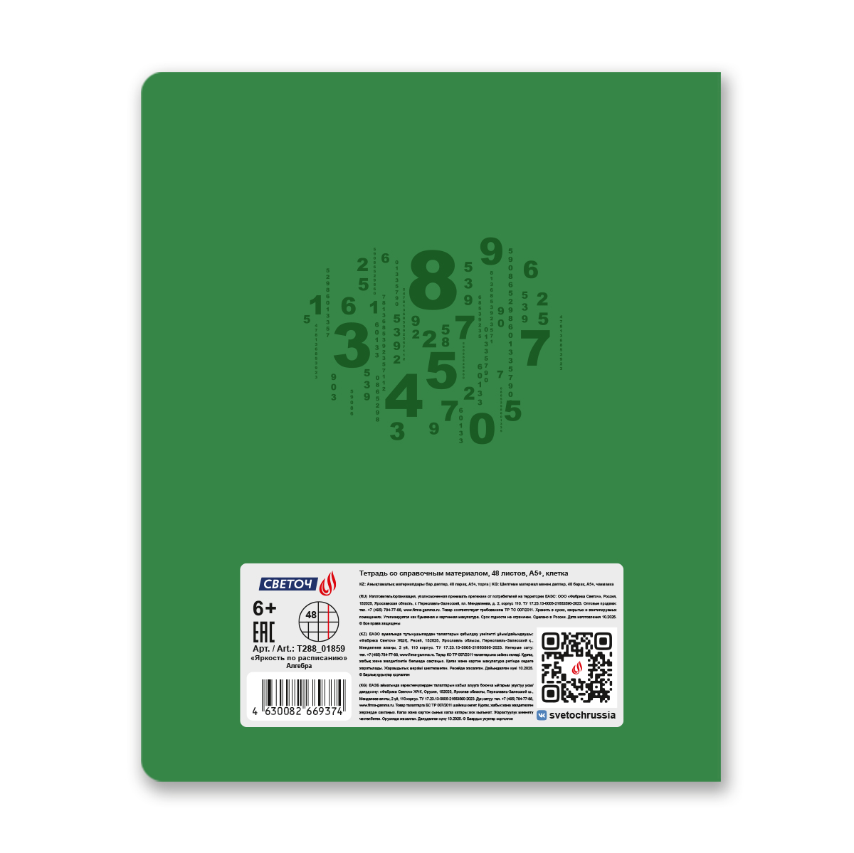 Светоч Т288 Тетрадь со справ.материал. Яркость по расписанию с запечат. пластик.обл. 320мкм, A5 48 л. на скобе 65 г/кв.м , белизна 100 % , клетка 01859 Яркость по расписанию Алгебра Фото 3.