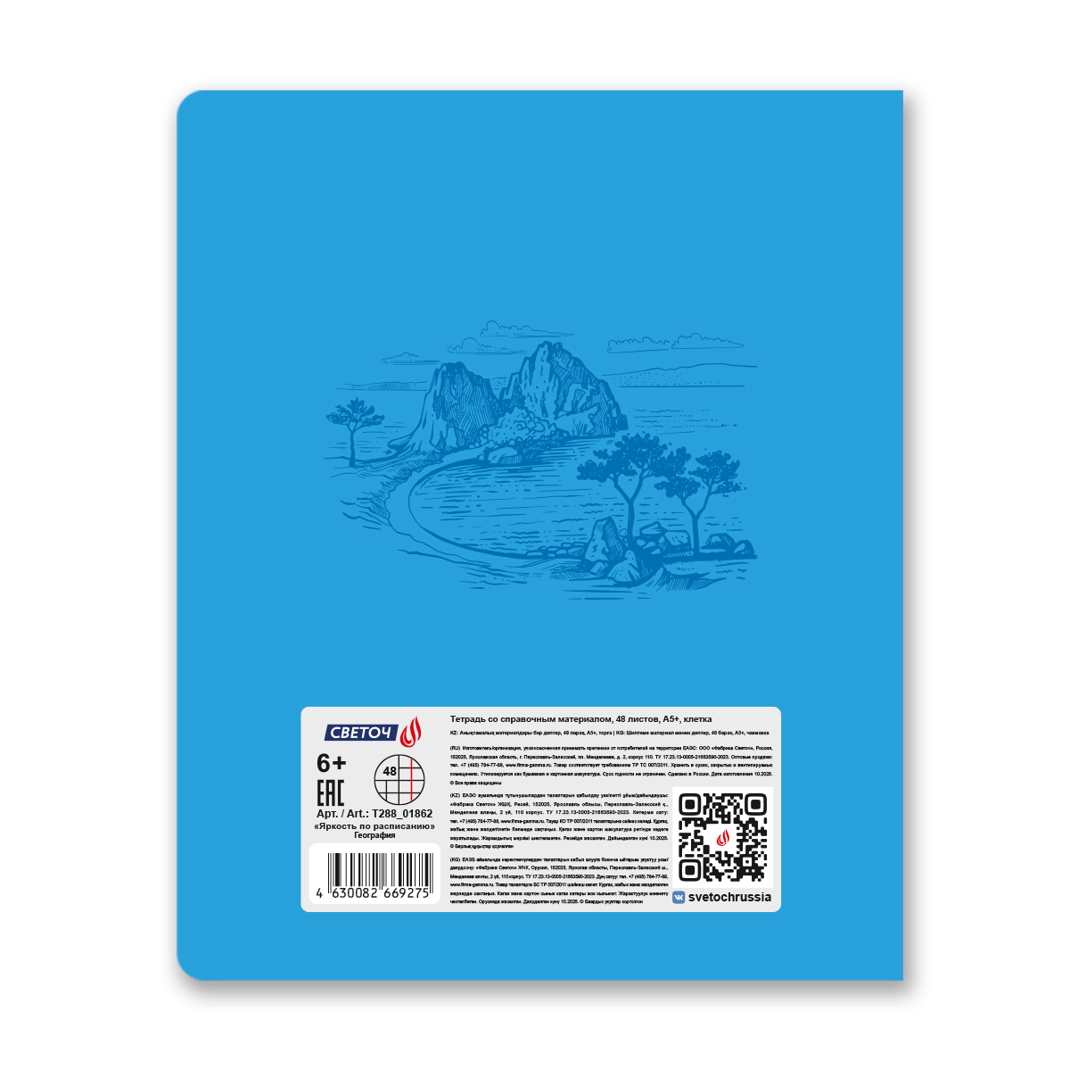 Светоч Т288 Тетрадь со справ.материал. Яркость по расписанию с запечат. пластик.обл. 320мкм, A5 48 л. на скобе 65 г/кв.м , белизна 100 % , клетка 01862 Яркость по расписанию География Фото 4.