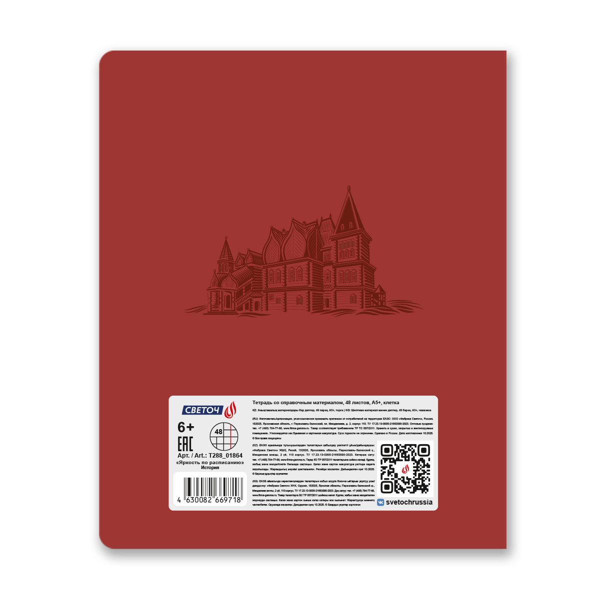 Светоч Т288 Тетрадь со справ.материал. Яркость по расписанию с запечат. пластик.обл. 320мкм, A5 48 л. на скобе 65 г/кв.м , белизна 100 % , клетка 01864 Яркость по расписанию История Фото 5.