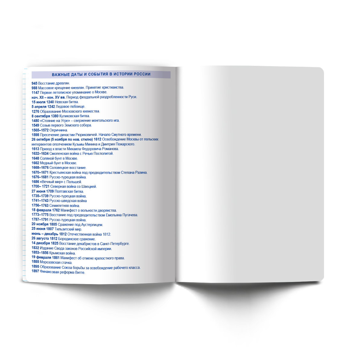 "Светоч" Т288 Тетрадь со справ.материал. "Яркость по расписанию" с запечат. пластик.обл. 320мкм, A5 48 л. на скобе 65 г/кв.м , белизна 100 % , клетка 01864 "Яркость по расписанию" История