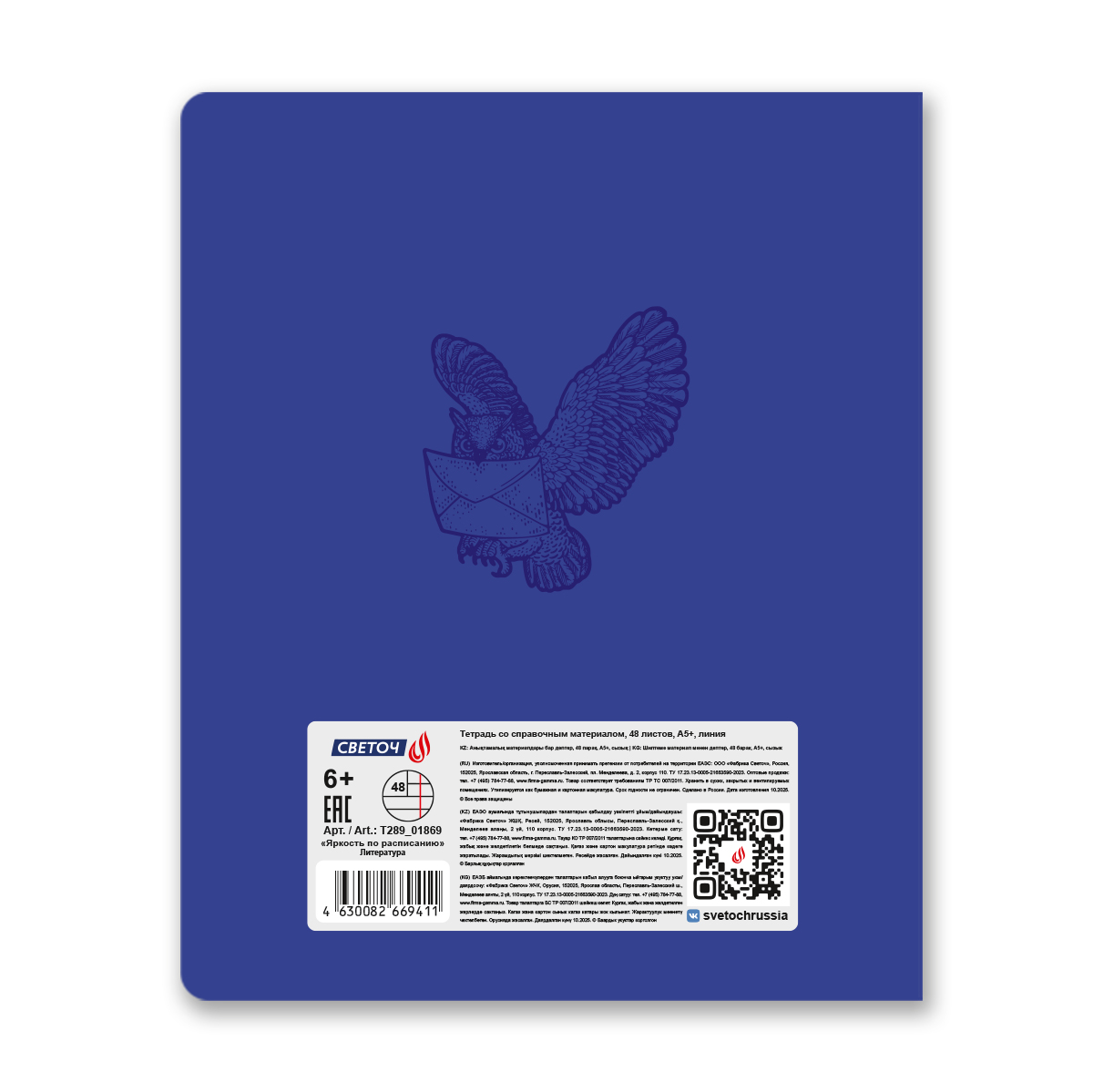 Светоч Т289 Тетрадь со справ.материал. Яркость по расписанию с запечат. пластик.обл. 320мкм, A5 48 л. на скобе 65 г/кв.м , белизна 100 % , линия 01869 Яркость по расписанию Литература Фото 6.