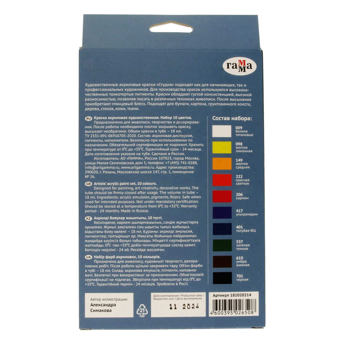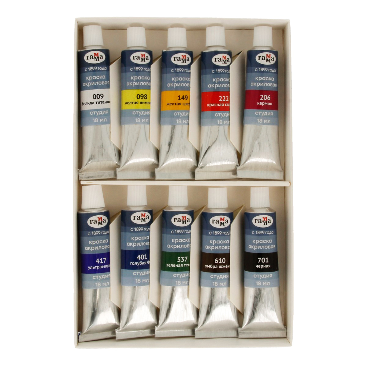 Набор новых акриловых красок «ГАММА» серии «Студия» предназначен для художественно-живописных и декоративно-прикладных работ. Главные отличия: насыщенные цвета, высокая адгезия, прочность красочного слоя. В упаковке 10 цветов. Объём тубы ? 18 мл. После высыхания краски становятся глянцевыми, практически не темнеют, специальная добавка позволяет максимально раскрыть красоту цветов. Художественный акрил прекрасно разносится, подходит для бумаги, картона, грунтованного холста, дерева, стекла, кожи, ткани. Время высыхания: от 10 минут до 1 часа в зависимости от толщины слоя. • Количество цветов: 10; • Упаковка: туба; • Объем тубы: 18 мл.