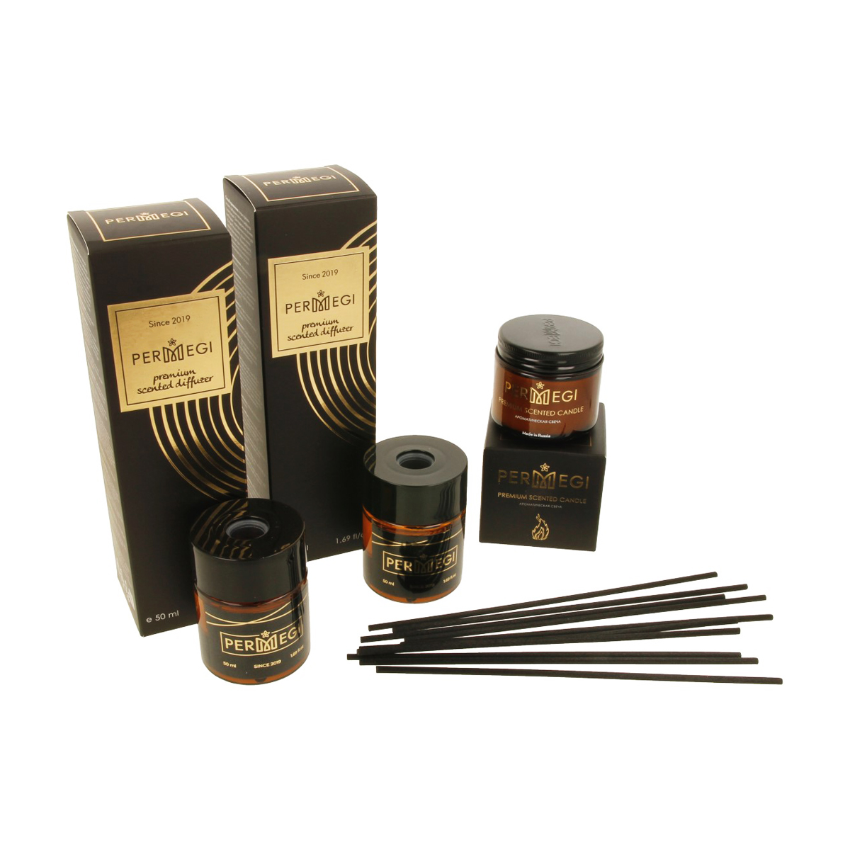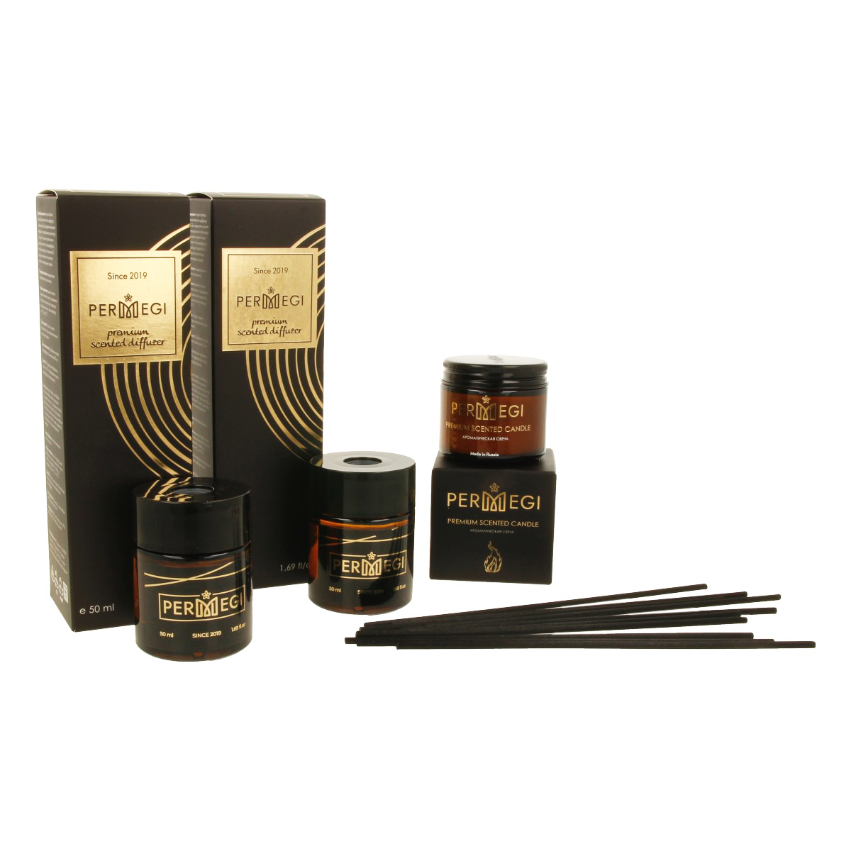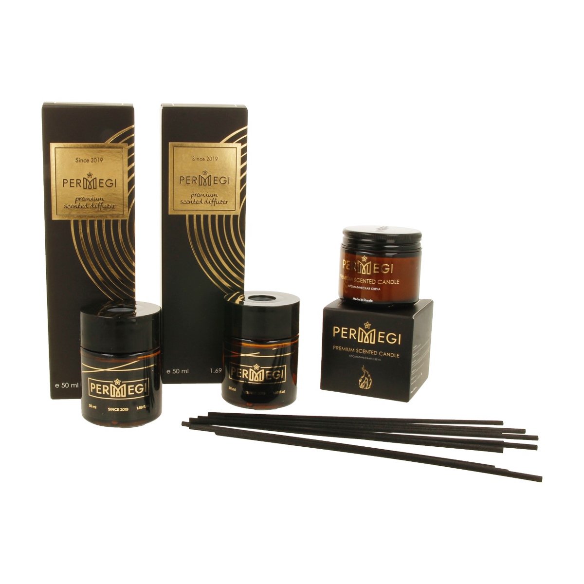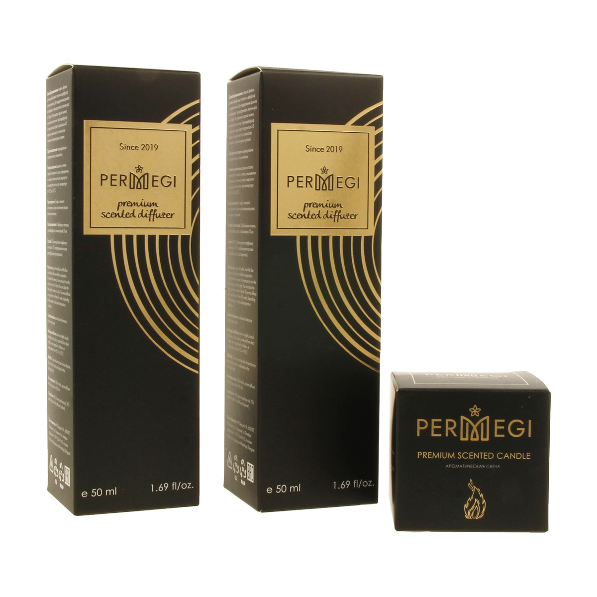 Подарочный набор Permegi – это целых 3 в 1 стильных и красиво упакованных предмета ароматизации, которые были созданы специально, как универсальный подарок женщине или мужчине. В него входит два аромадиффузора – Хлопок и Лаванда-Ваниль, и свечка Французский кофе. Диффузор для дома наполнит Вашу квартиру легким ненавязчивым благоуханием и поможет создать особую атмосферу. В комплекте стеклянный флакон объемом 50 мл с парфюмированной жидкостью и 5 фибровых аромапалочек, обладающих большой поглощающей способностью. Особенно удобно то, что Вы сможете сами регулировать интенсивность домашнего освежителя, добавляя или уменьшая количество палочек.