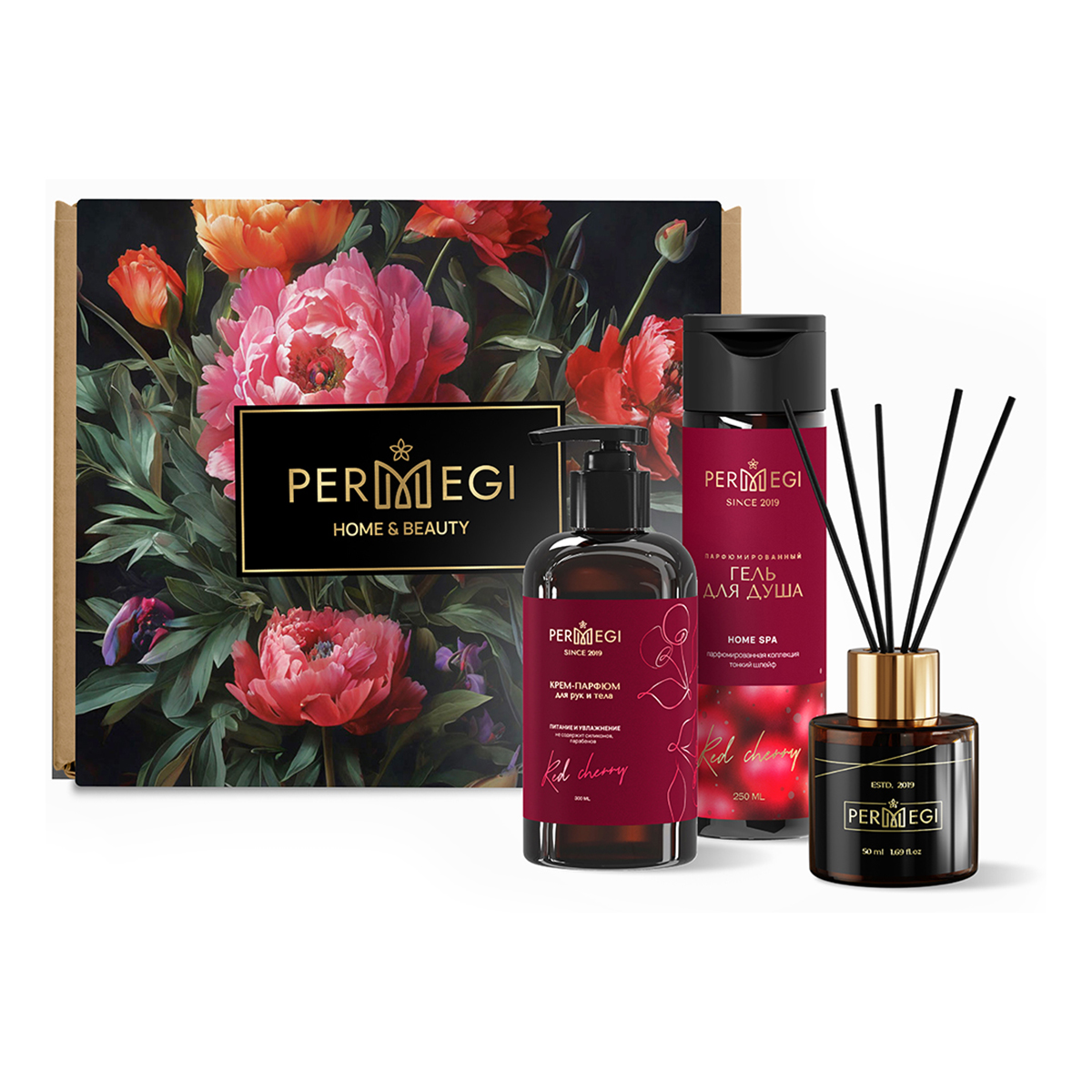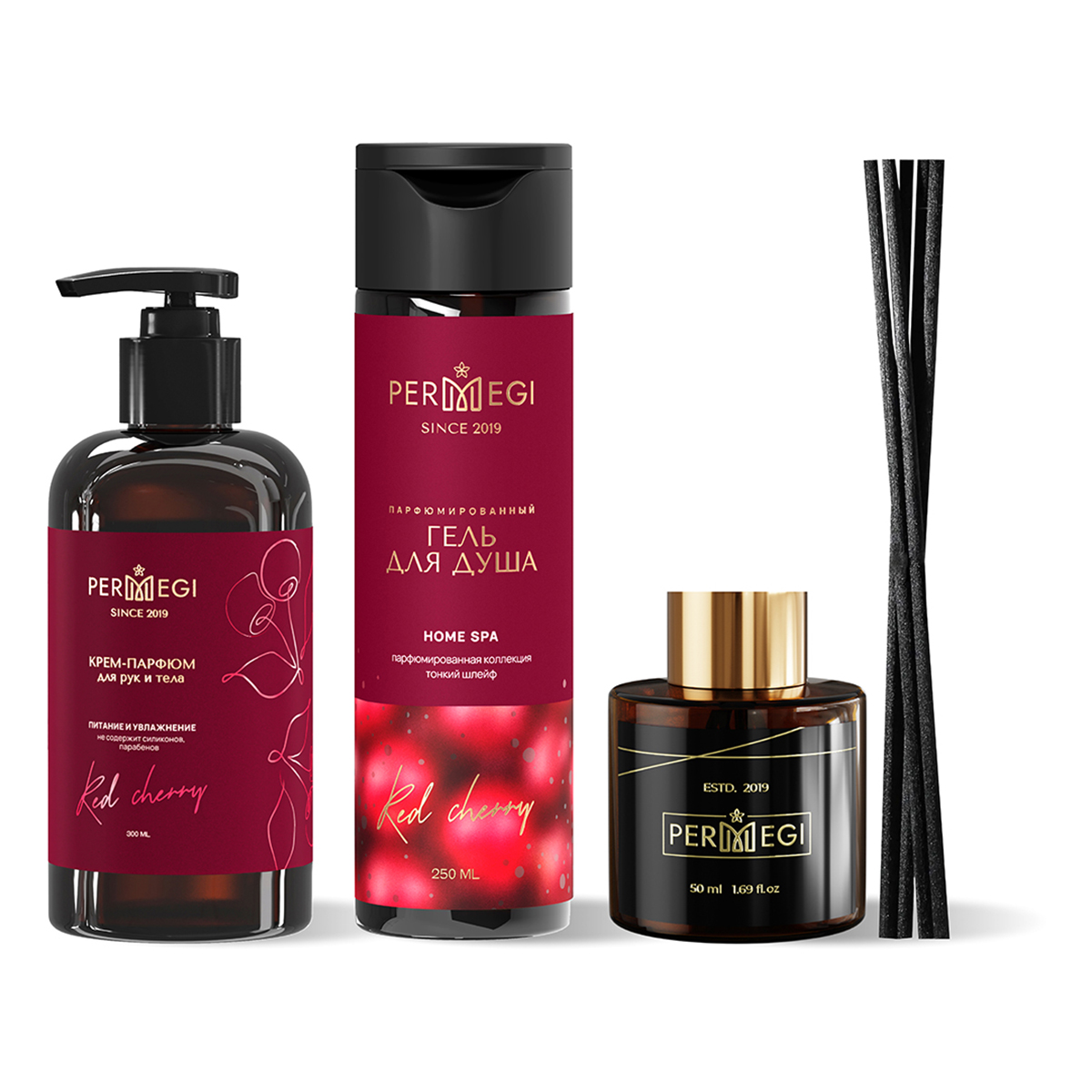 Комплект включает увлажняющий крем для рук и тела Red cherry в удобном флаконе с дозатором . Этот продукт обеспечивает глубокое увлажнение кожи, делая ее мягкой и ухоженной. Аромат красной вишни добавляет нотку свежести и расслабления. Парфюмированный гель для душа Red cherry станет прекрасным началом дня. Его нежная текстура очищает кожу, оставляя после себя приятный аромат. Уникальное сочетание компонентов помогает поддерживать баланс влаги, даря ощущение свежести после каждого купания. Диффузор для дома наполнит ваш интерьер изысканным ароматом, создавая уютную атмосферу. Его легкий шлейф делает пространство более гармоничным и располагающим к отдыху. Он отлично подходит как для банного ритуала, так и для повседневного использования.