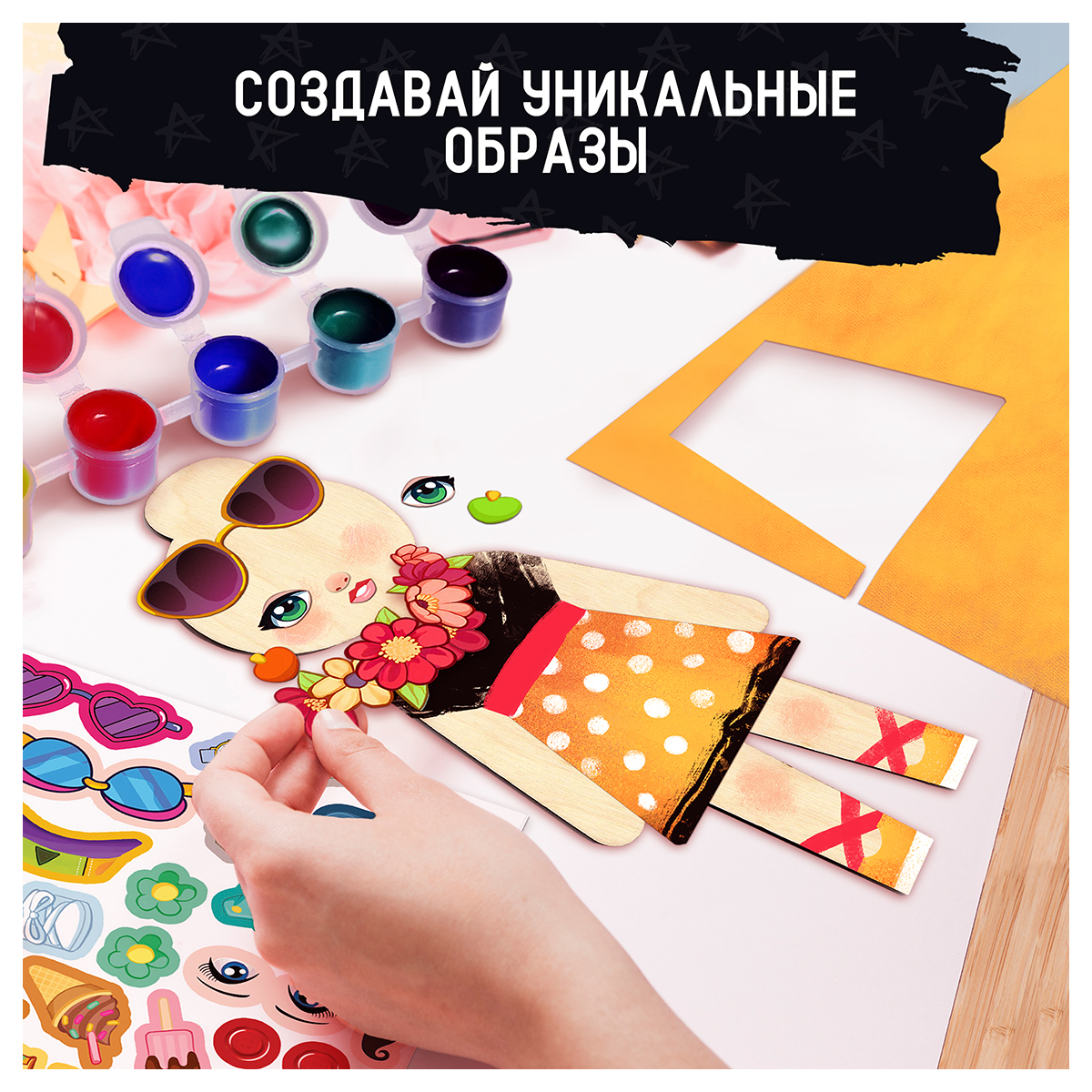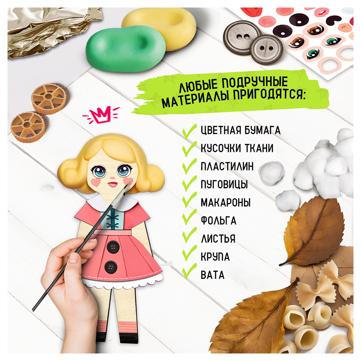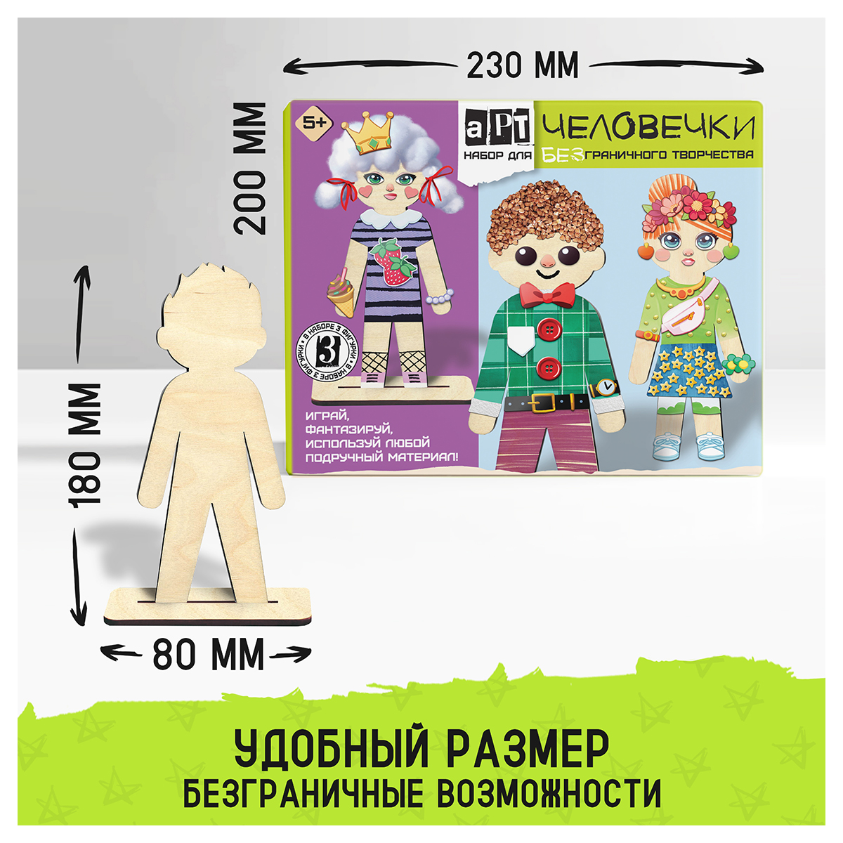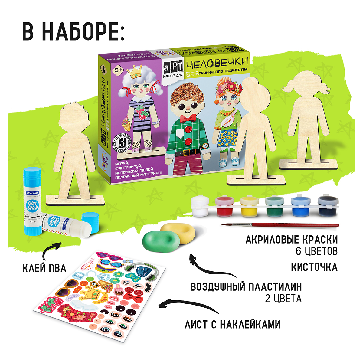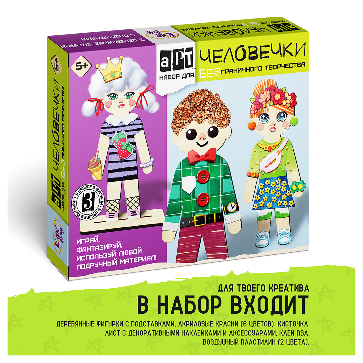 Набор для БЕЗграничного творчества - "Арт-человечки" - этот удивительный набор станет настоящим подарком для каждого ребёнка, а также родителей, заботящихся о развитии своих детей. Это не просто набор для творчества, это настоящее приключение для детей и возможность для родителей увидеть, как их ребёнок раскрывает свои таланты. Что входит в набор? 3 фигуры из фанеры высотой по 18 см, которые можно превратить в кого угодно – от весёлых клоунов до волшебных фей! 3 подставки из фанеры, чтобы ваши творения могли гордо стоять на полке или столе. Лист с наклейками [формат А5] с разнообразными аксессуарами: одеждой, украшениями, чертами лица – всё, что нужно для создания уникальных персонажей. 6 баночек красок с кисточкой, чтобы раскрасить свои фигурки в разные цвета. 2 пакетика с воздушным пластилином – лёгким и удобным материалом для декорирования, который быстро твердеет на воздухе. Клей, чтобы закрепить все детали на своих местах. С нашим развивающим набором каждый ребёнок сможет создать свои уникальные фигурки, придумывая разнообразные причёски, лица и наряды. Но это только начало! Используйте любые подручные материалы: крупы, макароны, бумагу, обрезки ткани, пуговицы, пряжу, фольгу, природные материалы. Всё, что найдётся дома, может стать частью вашего творческого проекта! Почему "Арт-человечки"? Развитие творческих способностей: набор помогает развивать фантазию и креативность, позволяя детям создавать уникальные произведения искусства. Усидчивость и мелкая моторика: Процесс создания фигурок требует внимания к деталям и аккуратности, что способствует развитию мелкой моторики. Идеальный подарок: Яркий и увлекательный набор станет отличным подарком на любой праздник, радующий и детей, и их родителей. Присоединяйтесь к миру "Арт-человечков" и подарите своим детям возможность безграничного творчества и радость созидания!В наборе: 3 куклы из фанеры, 3 подставки из фанеры, лист с наклейками [формат А5], 6 баночек красок с кисточкой, клей ПВА, 2 пакетика с воздушным пластилином